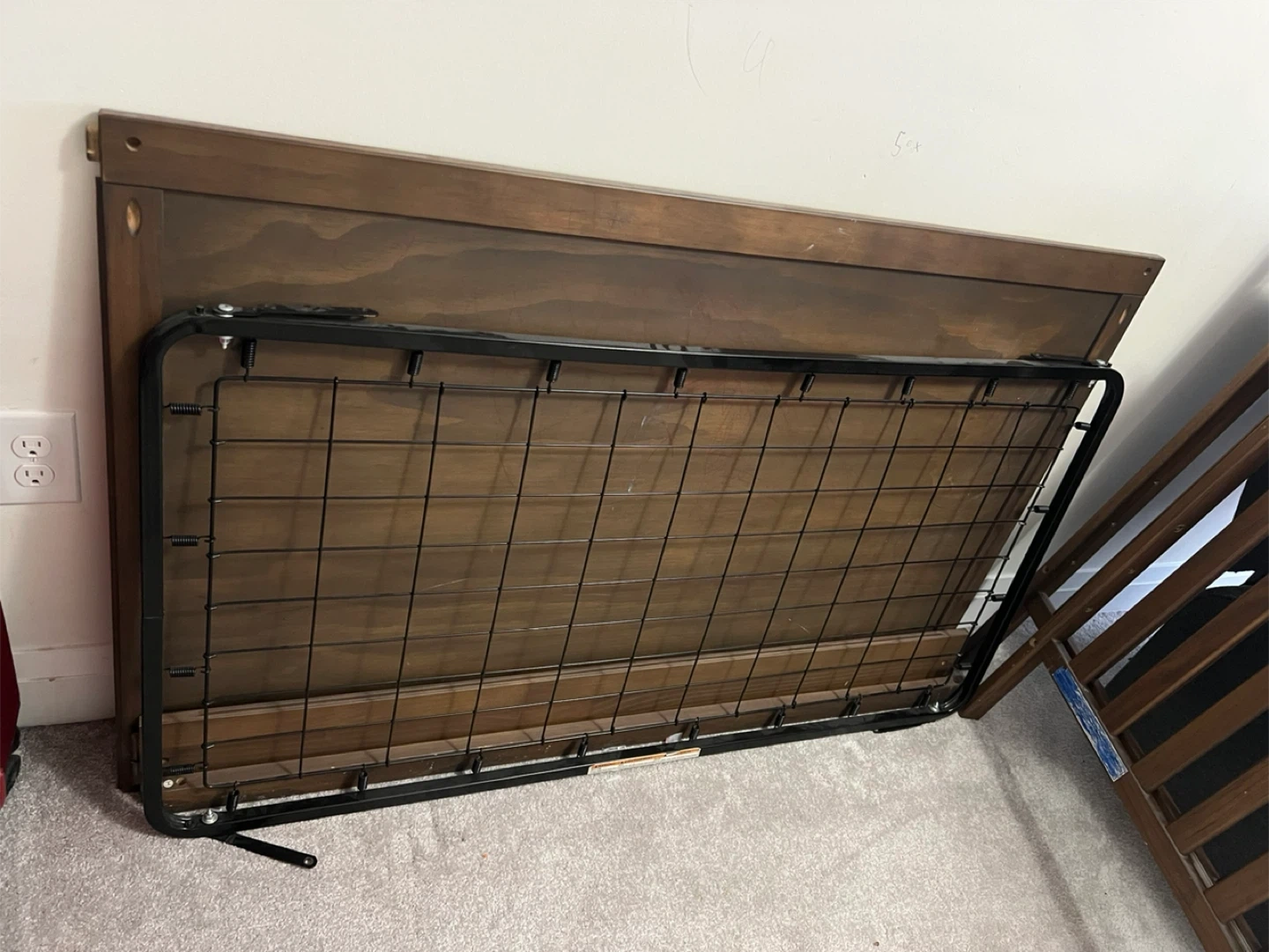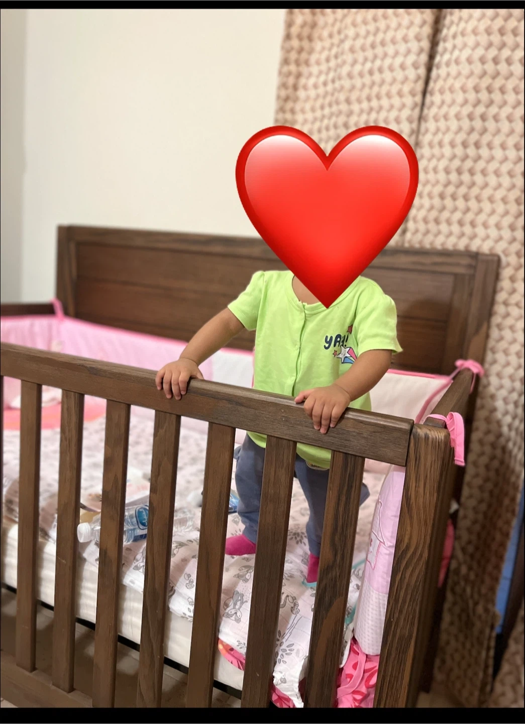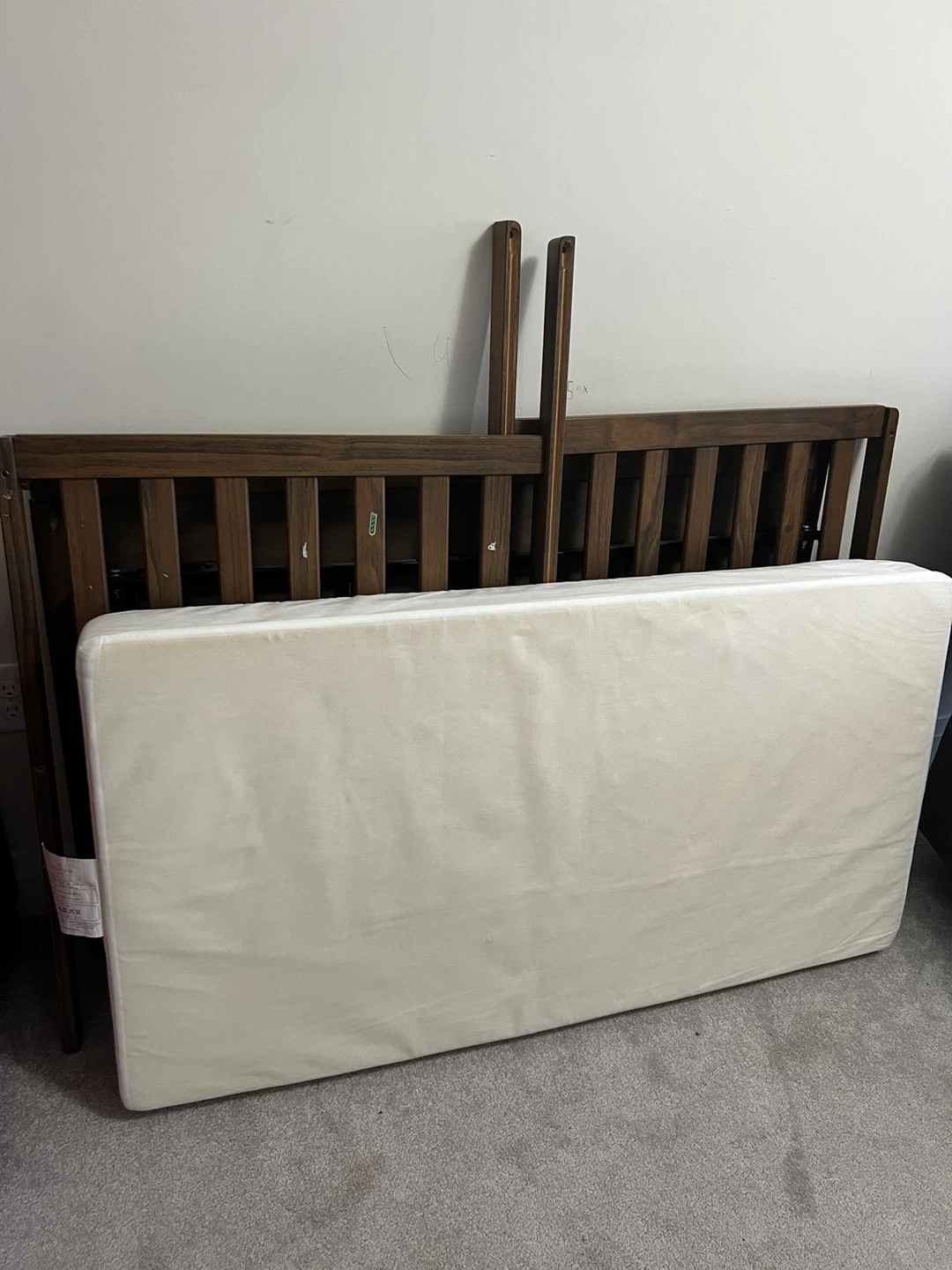 This is a sturdy wooden crib for babies. It's made from dark wood with a slatted design. The crib comes with a mattress that appears to be in good condition. It's a safe and reliable option for your little one.