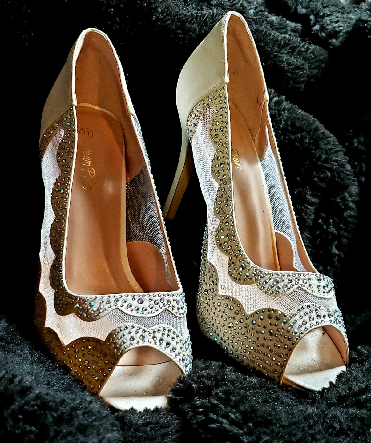 They feature a peep-toe design with sparkling rhinestones and mesh detailing.