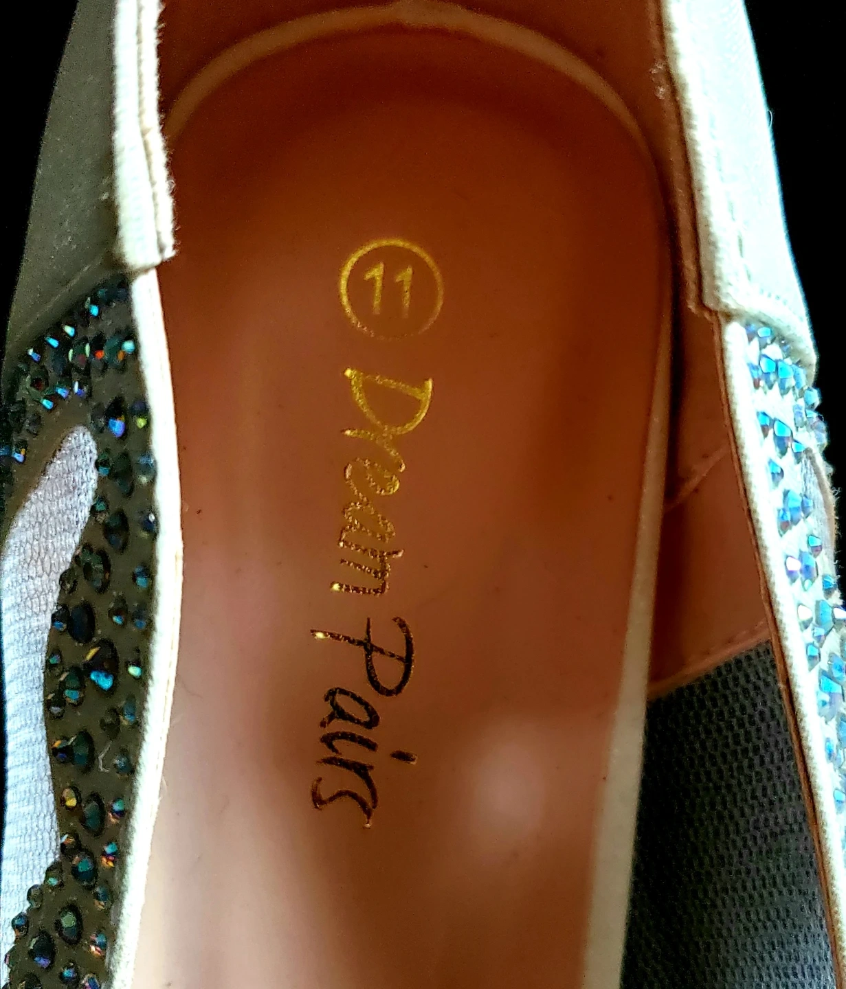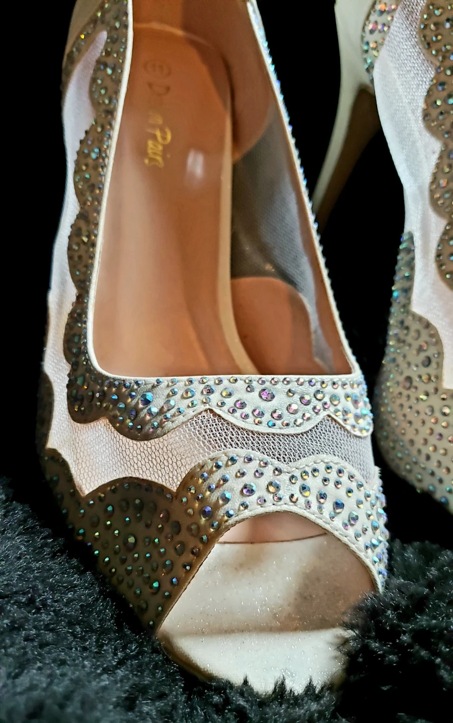 They feature a peep-toe design with sparkling rhinestones and mesh detailing.