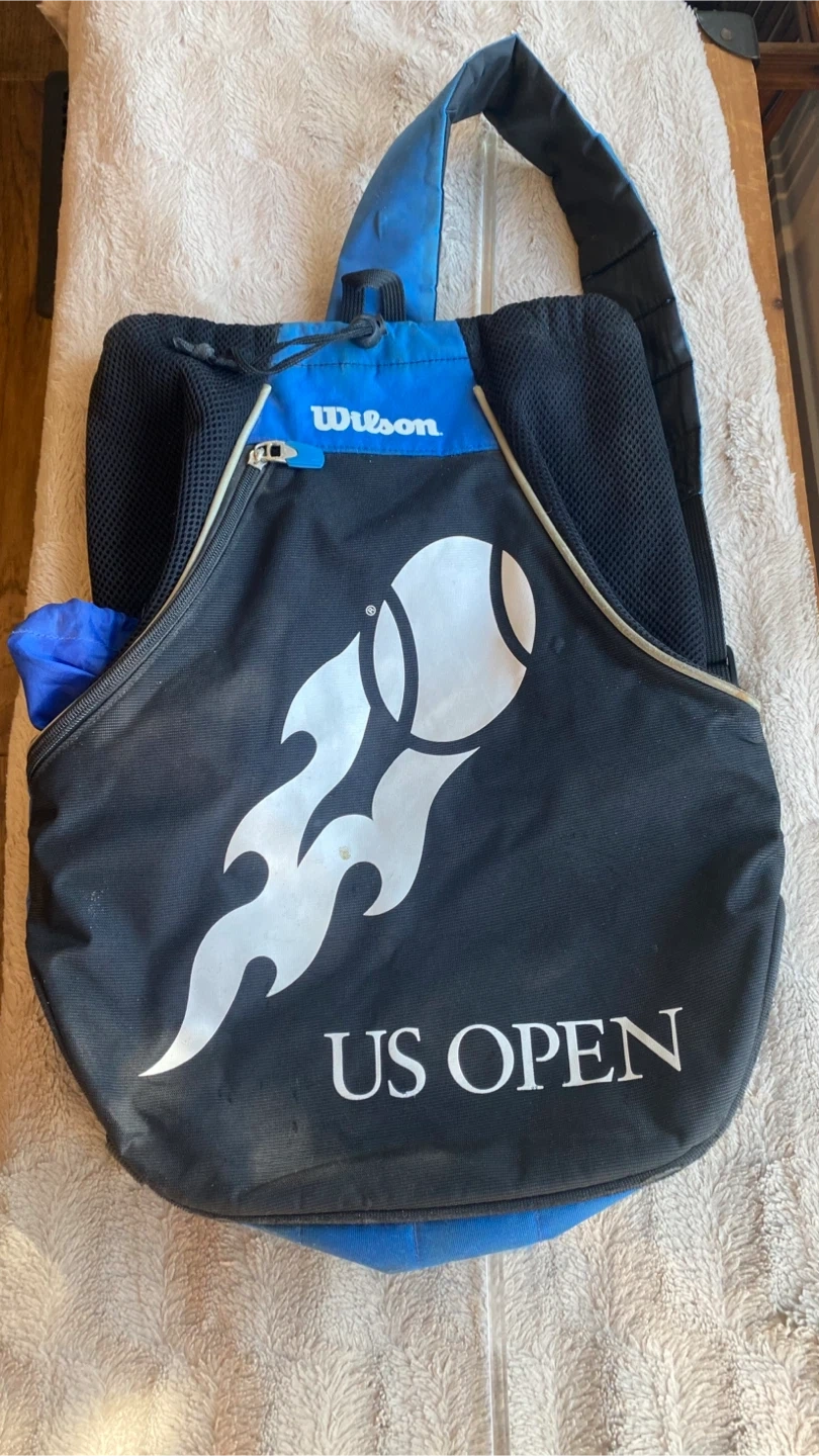Selling a Wilson US Open tennis backpack! It's perfect for carrying your racquets and other gear to the court. The bag features a black and blue design with the US Open logo. It has a comfortable shoulder strap and plenty of room for all your tennis essentials