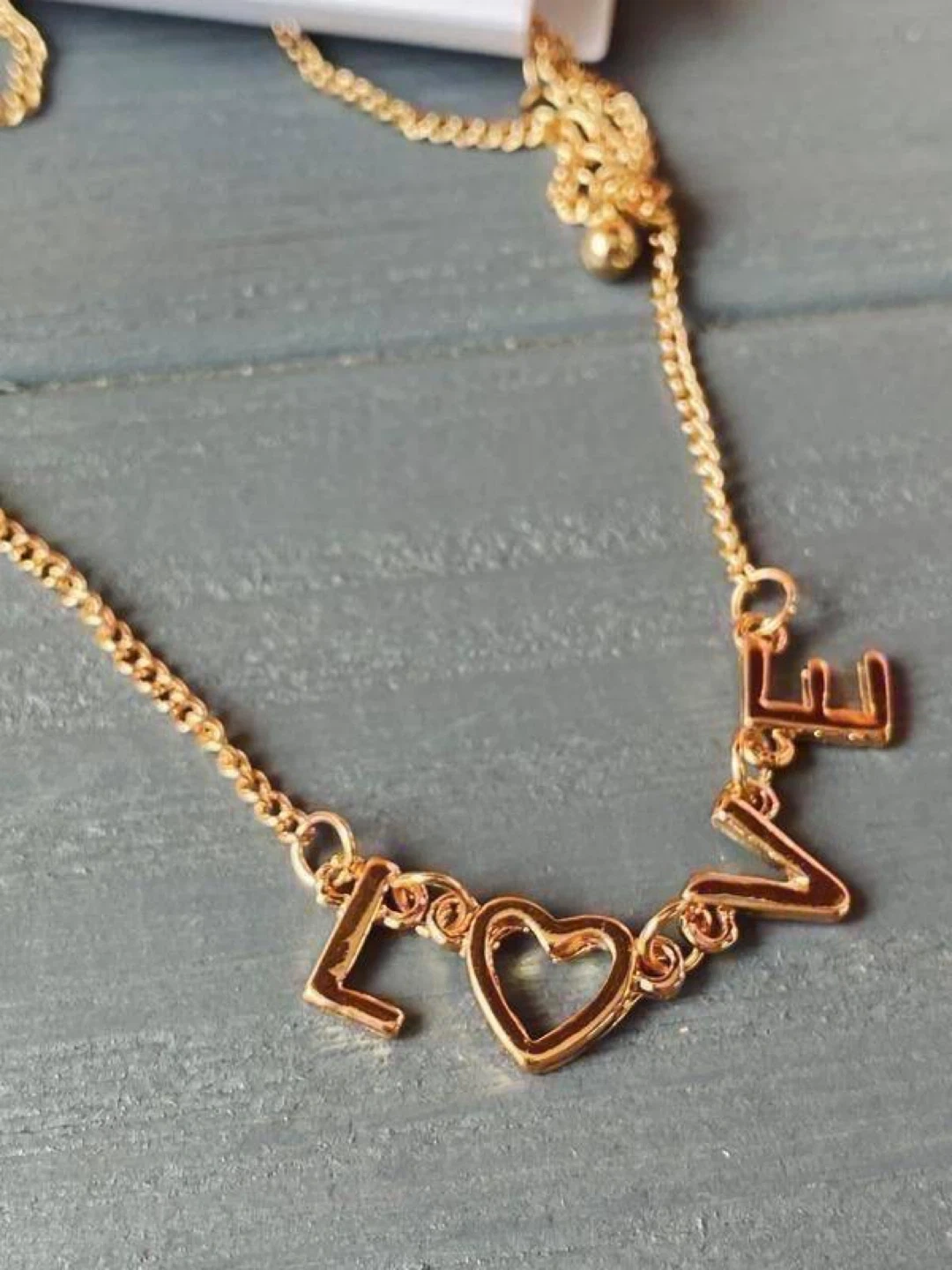 Gold-tone chain necklace featuring a “LOVE” pendant with a heart replacing the “O” ❤️