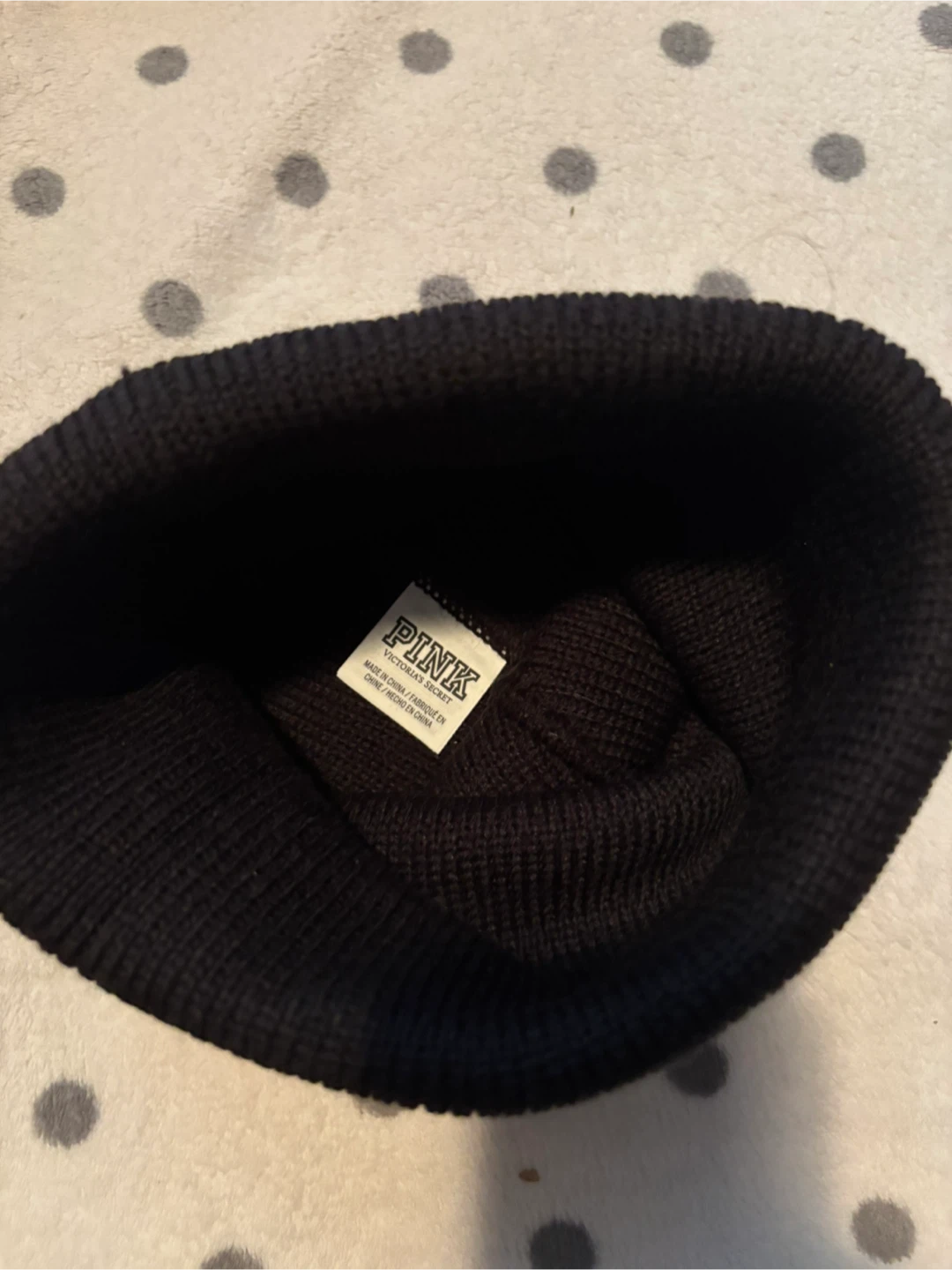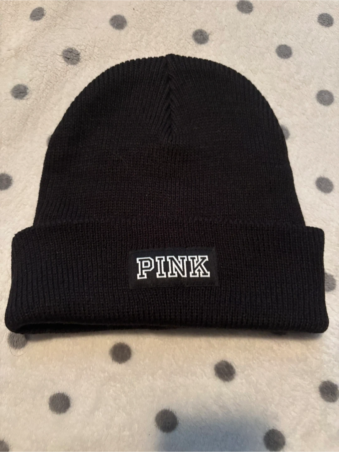 This is a black ribbed knit beanie from Victoria's Secret Pink. It's a one-size-fits-most accessory. Perfect for keeping warm on cooler days!