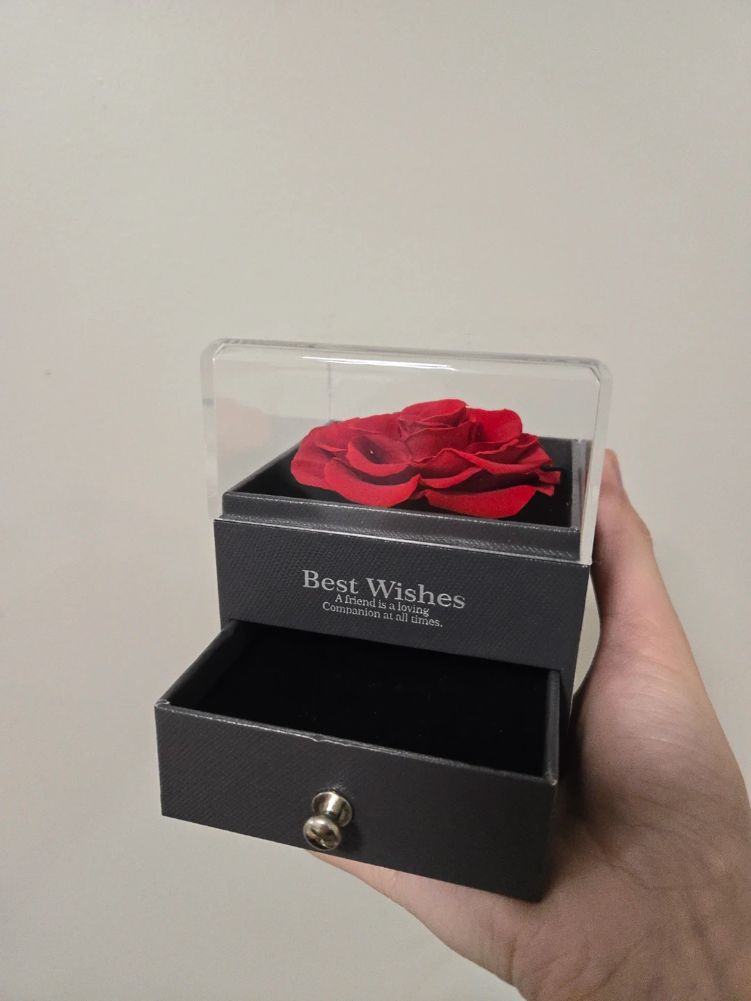 Selling a beautiful preserved red rose in a clear acrylic box! It's brand new and would make a lovely decorative piece. The box has a small drawer at the bottom to put jewelry.