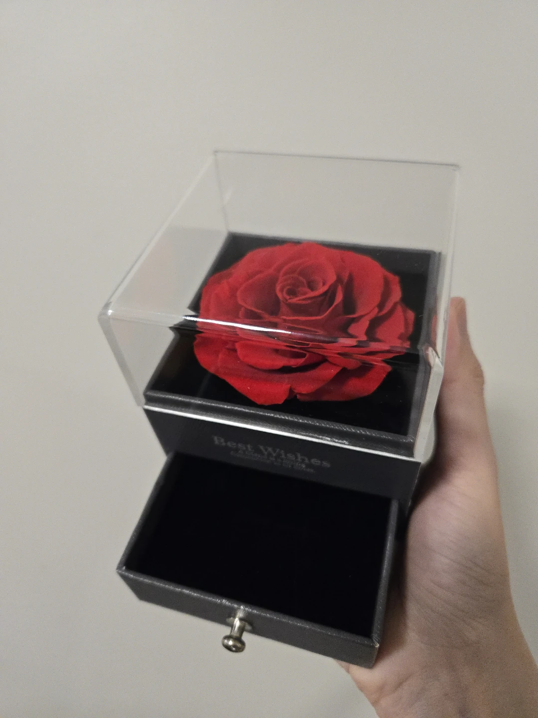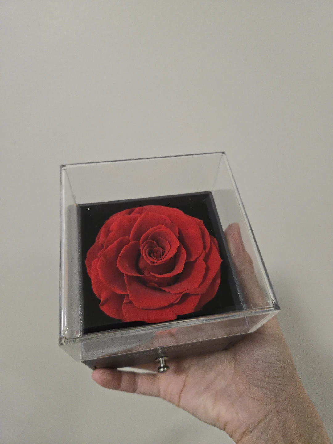Selling a beautiful preserved red rose in a clear acrylic box! It's brand new and would make a lovely decorative piece. The box has a small drawer at the bottom to put jewelry.