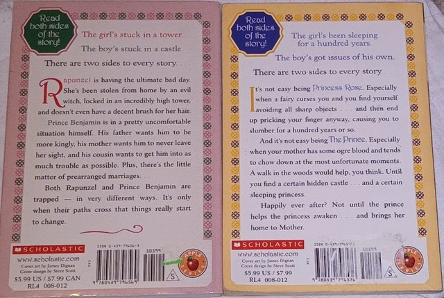 Used - Like new. Set of 2 "Twice Upon A Time" books: Rapunzel, the One with All the Hair & Sleeping Beauty, the One Who Took the Really Long Nap. Price: $6. Located in Summerside, SE London. Smoke-free home. Rapunzel is having the ultimate bad day. She's been stolen from home by an evil witch, locked in an incredibly high tower, and doesn't even have a decent brush for her hair. Prince Benjamin is in a pretty uncomfortable situation himself. His father wants him to be more kingly, his mother wants him to never leave her sight, and his cousin wants to get him into as much trouble as possible. Plus, there's the little matter of prearranged marriages. . . . Both Rapunzel and Prince Benjamin are trapped . . . in very different ways. It's only when their paths cross that things change. & The girl's been asleep for a hundred years. The boy's got issues of his own. There are two sides to every story.... It's not easy being Princess Rose. Especially when a fairy curses you and you find yourself avoiding all sharp objects . . . and then end up pricking your finger anyway, causing you to slumber for a hundred years or so. And it's not easy being The Prince. Especially when your mother has some ogre blood and tends to chow down at the most unfortunate moments. A walk in the woods would help, you think. Until you find a certain hidden castle . . . and a certain sleeping princess. Happily ever after? Not until the prince helps the princess awaken . . . and brings her home to Mother. Journey back to the days when fairy tales were true with this fun and fresh spin on a timeless tale!