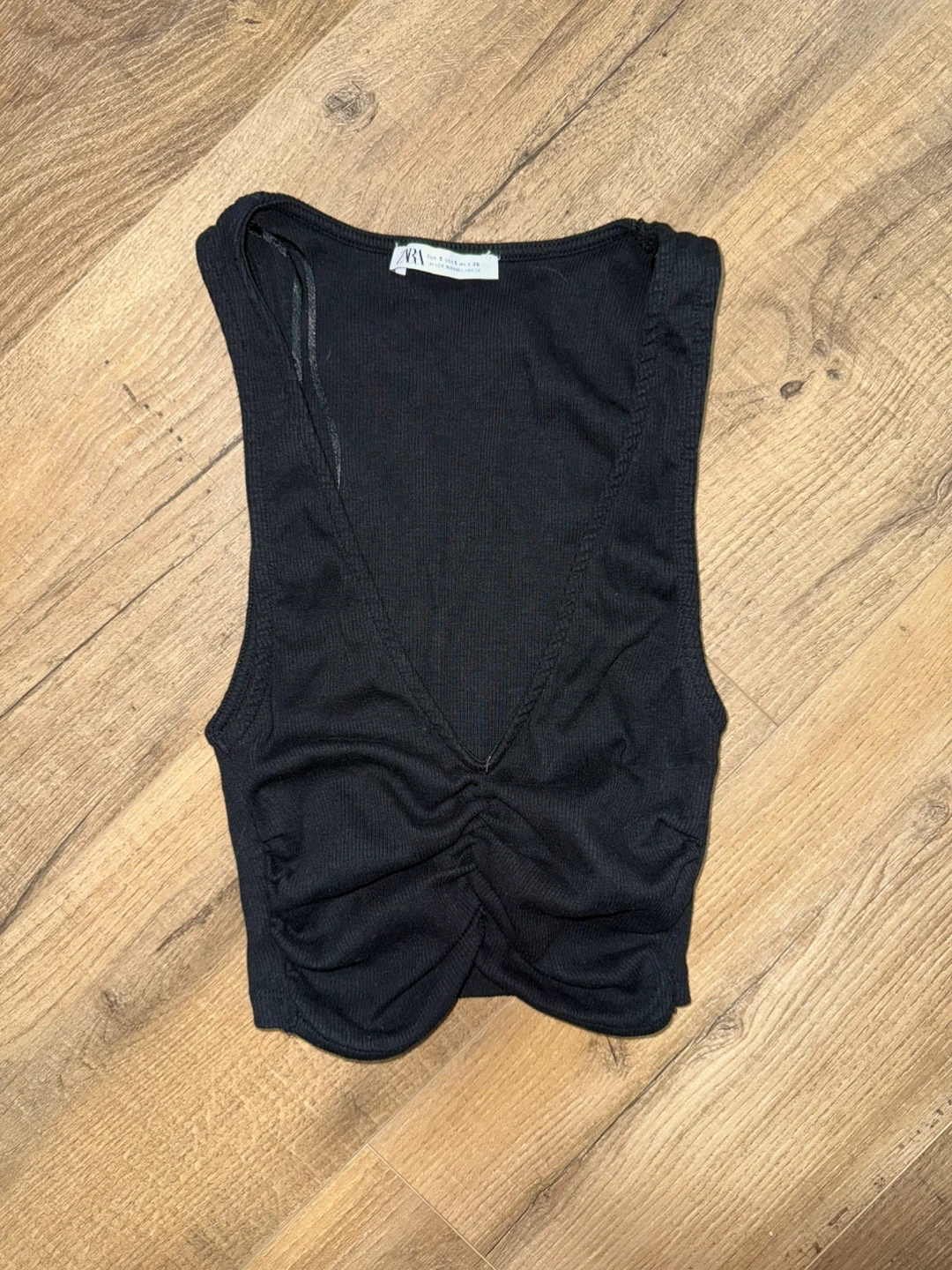 Buy & SellBlack Zara Ruched V-Neck Tank TopBlack Zara Ruched V-Neck Tank Top$9This is a black Zara ruched V-neck tank top. It's made of a ribbed material. It's a size S. Perfect condition. Crop top.ConditionLike newSizeSmallBrandZaraWHERE TO MEETChristieView MapSELLERverifiedAlexKoreatown1024 reviews0 chats·0 favorites·2 viewsSEND CHAT TO SELLERHi Alex! I’m interested in your listing.Hi Alex! I’m interested in your listing.Get the Karrot app to chatSign In to chat