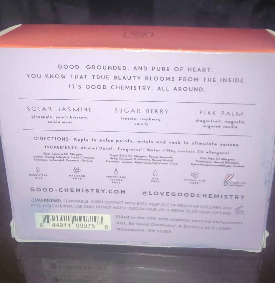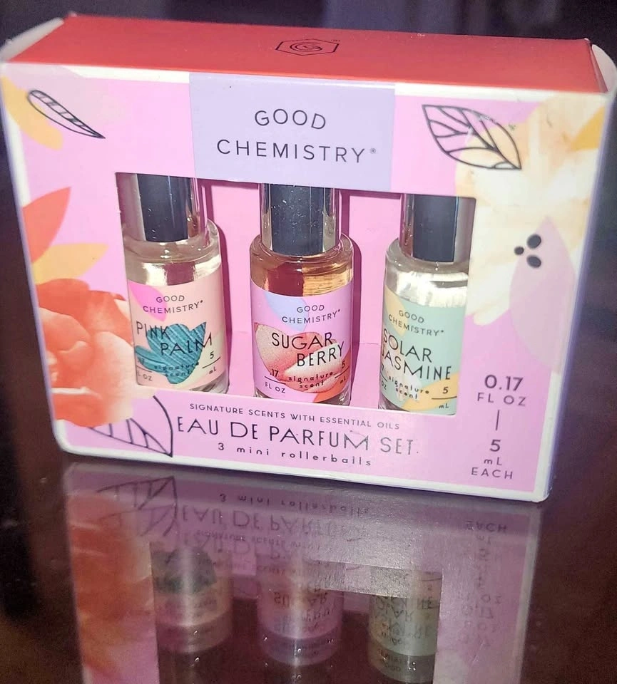 Good Chemistry Eau de Parfum Set with 3 mini rollerballs. Scents: Includes Pink Palm, Sugar Berry, and Solar Jasmine. Each rollerball contains 0.17 fl oz (5 mL) of product. Made with essential oils, vegan, cruelty-free, and free from parabens and propylene glycol. Sugar Berry has notes of freesia, raspberry, and vanilla. Solar Jasmine features notes of pineapple, peach blossom, and sandalwood. These all smell amazing!