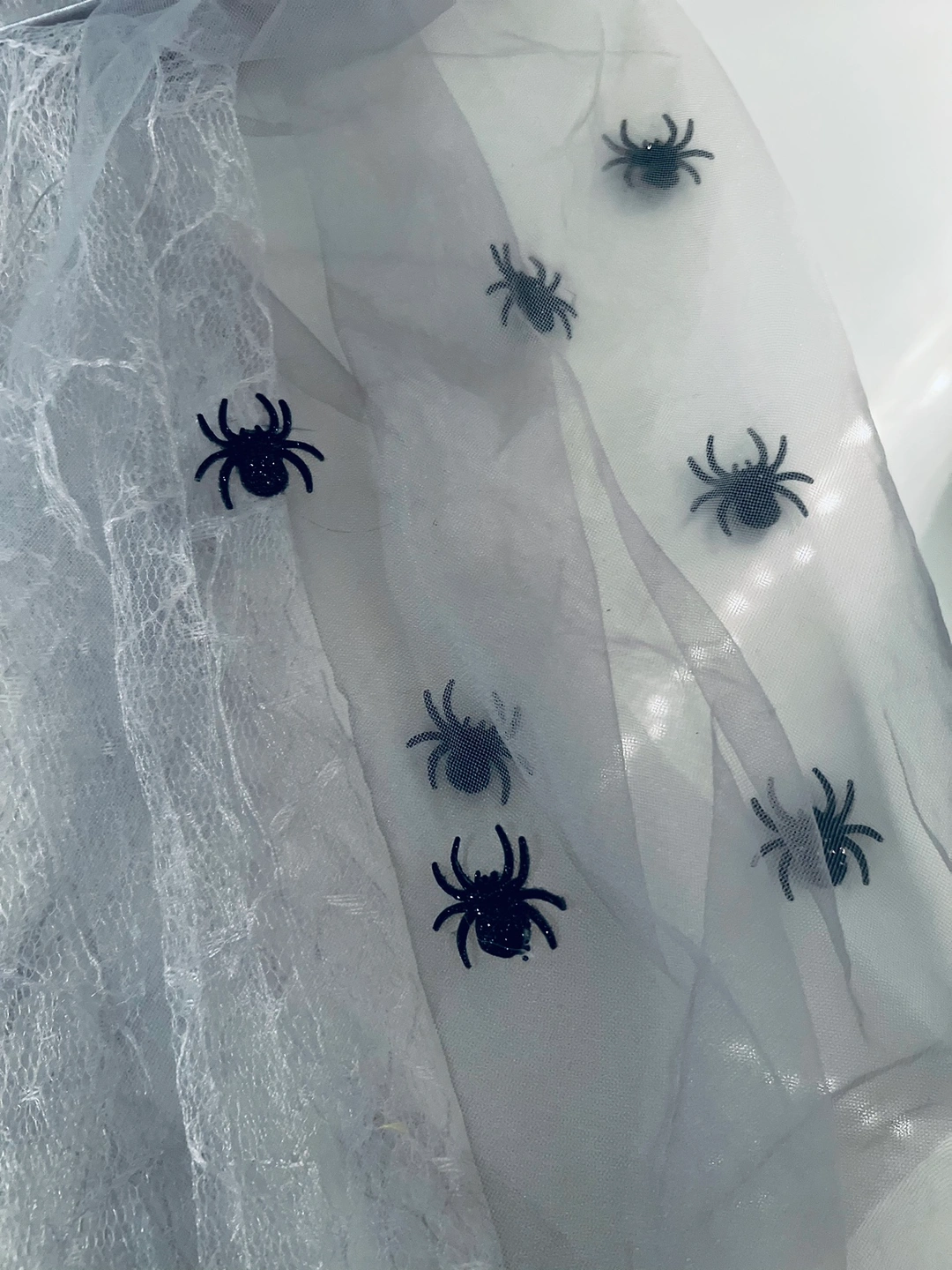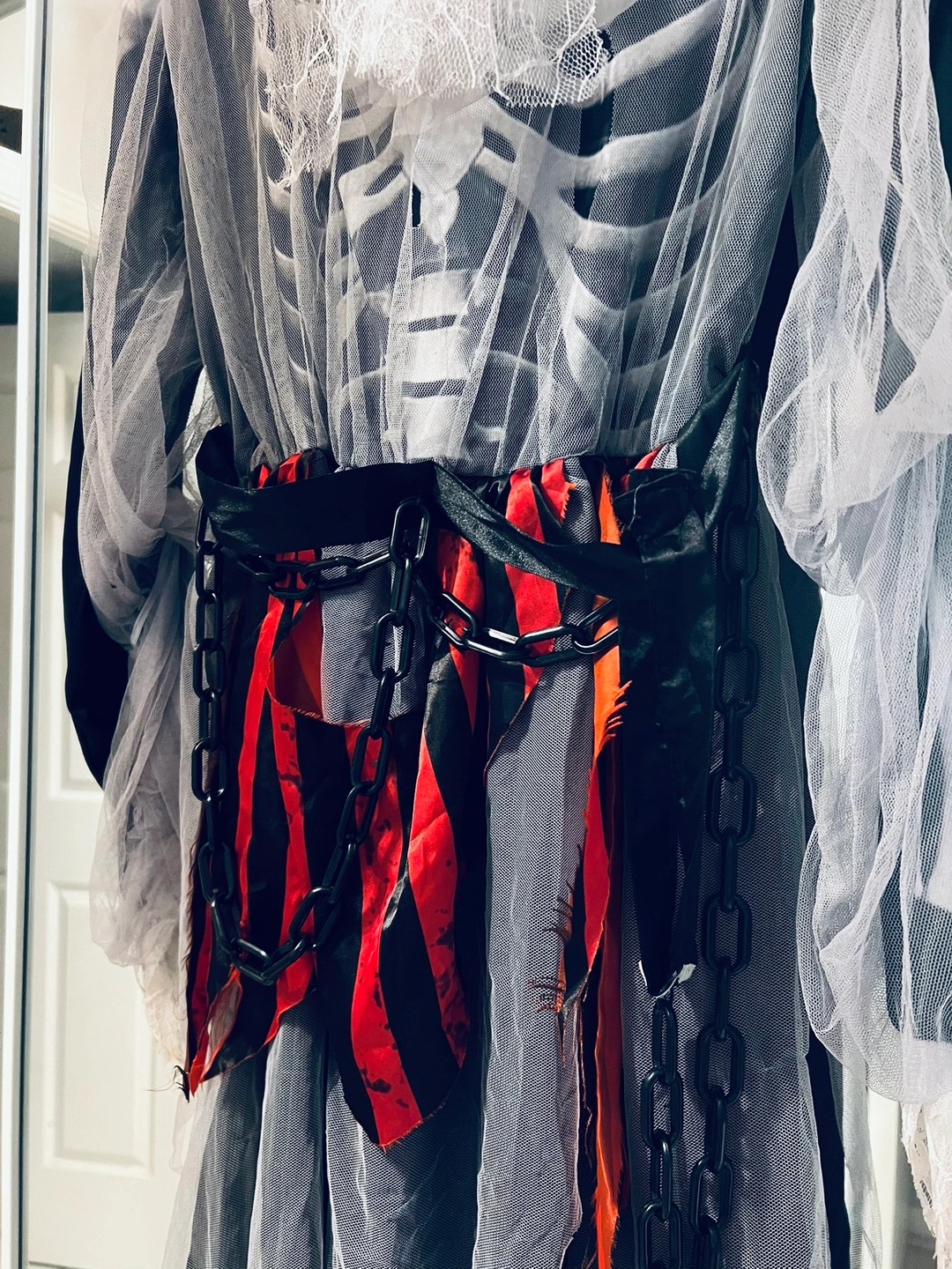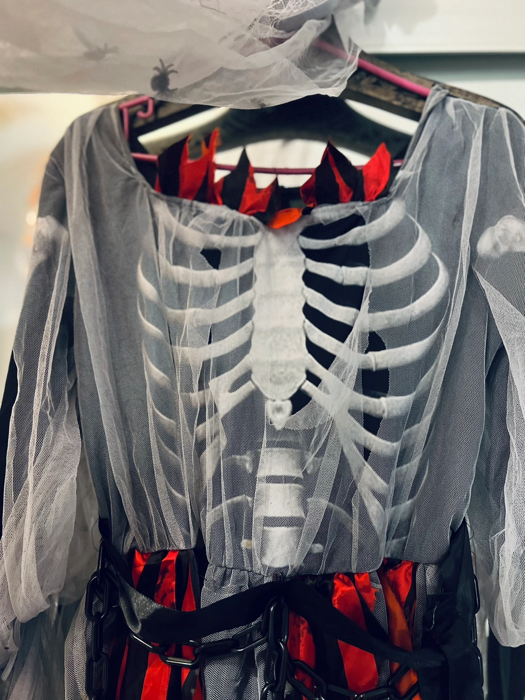 This adult-sized skeleton zombie bride costume is the ultimate spooky yet stylish choice for Halloween. The costume is black, with red and black stripe tears, shear grey mesh to resemble a brides’ dress with detailed bone graphics across the chest. The ensemble is completed with a sheer veil, with black and grey flowers and spiders adding an eerie, ghostly touch. The outfit also comes with a black plastic chain around the waist with an attachment that be worn around the neck or hand. Size Woman’s S-M