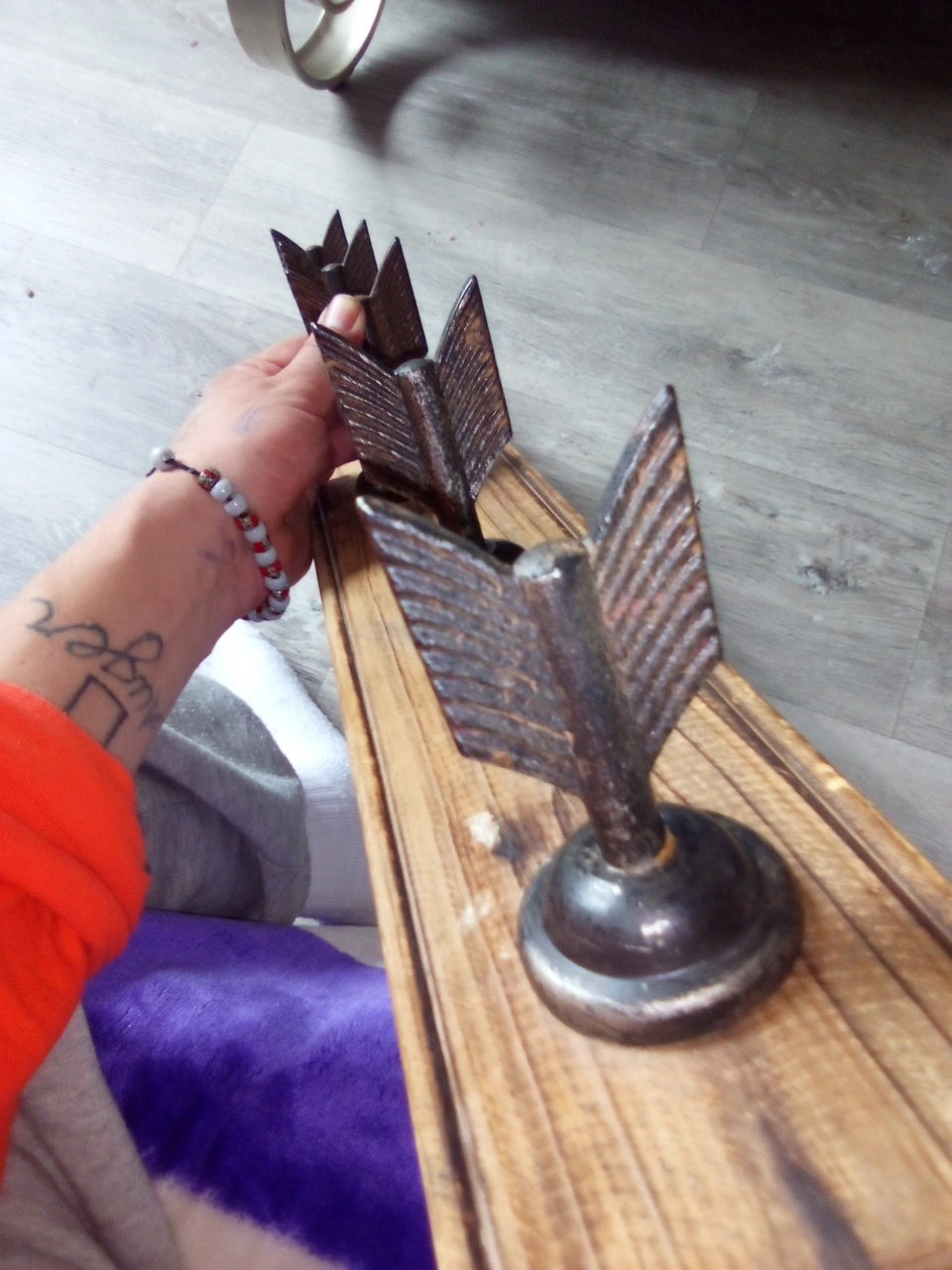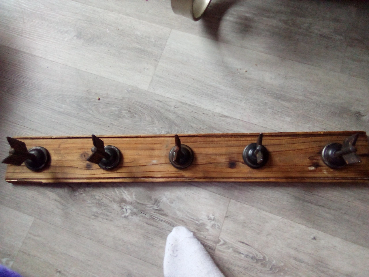Features a wooden plank. It has five metal hooks shaped like arrows. This coat rack would be perfect for adding some character to your entryway. 10 or obo