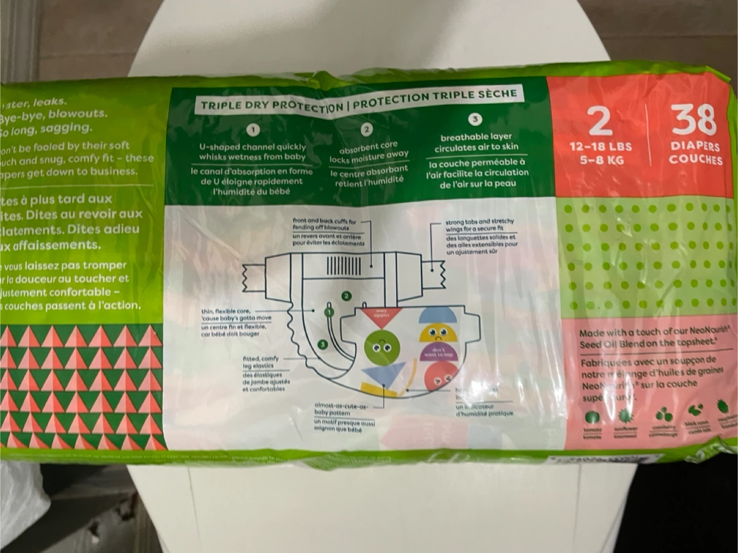 I have a pack of Babyganics diapers, size 2, for sale. This pack contains 38 diapers, suitable for babies weighing 12-18 lbs (5-8 kg). They feature triple dry protection and are made with baby's skin in mind. They are also made without latex, petroleum-based lotions, or chlorine processing