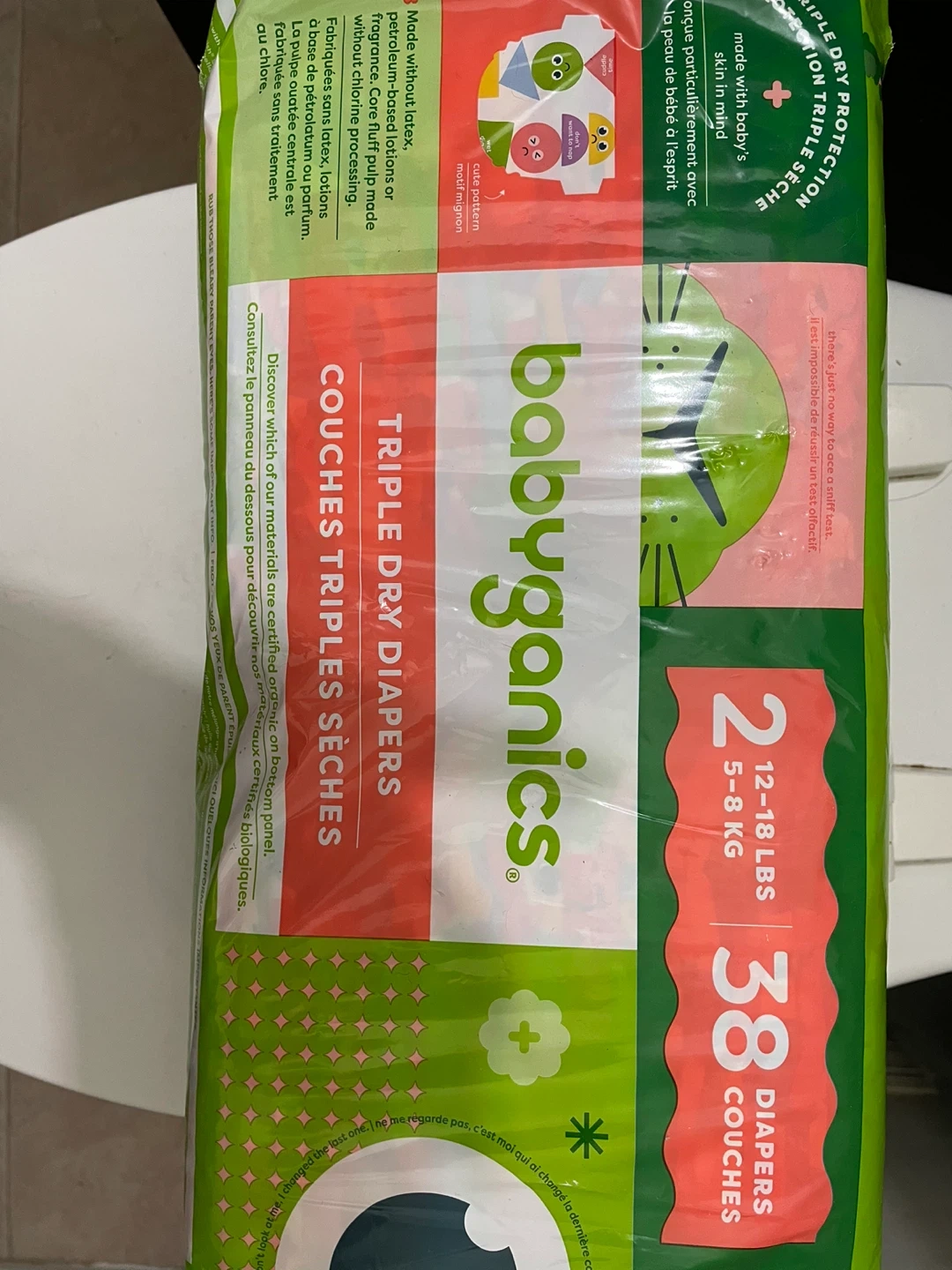 I have a pack of Babyganics diapers, size 2, for sale. This pack contains 38 diapers, suitable for babies weighing 12-18 lbs (5-8 kg). They feature triple dry protection and are made with baby's skin in mind. They are also made without latex, petroleum-based lotions, or chlorine processing