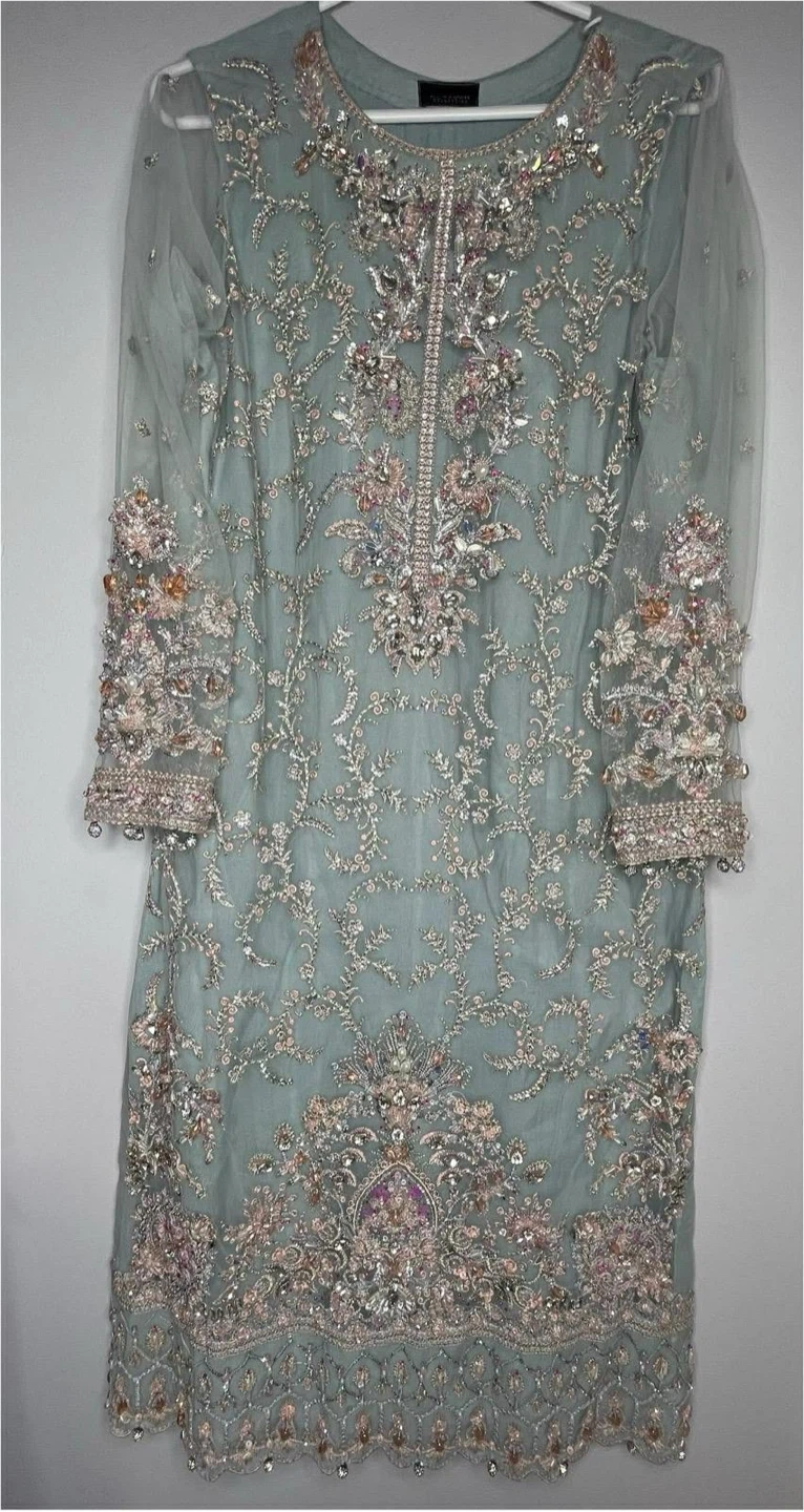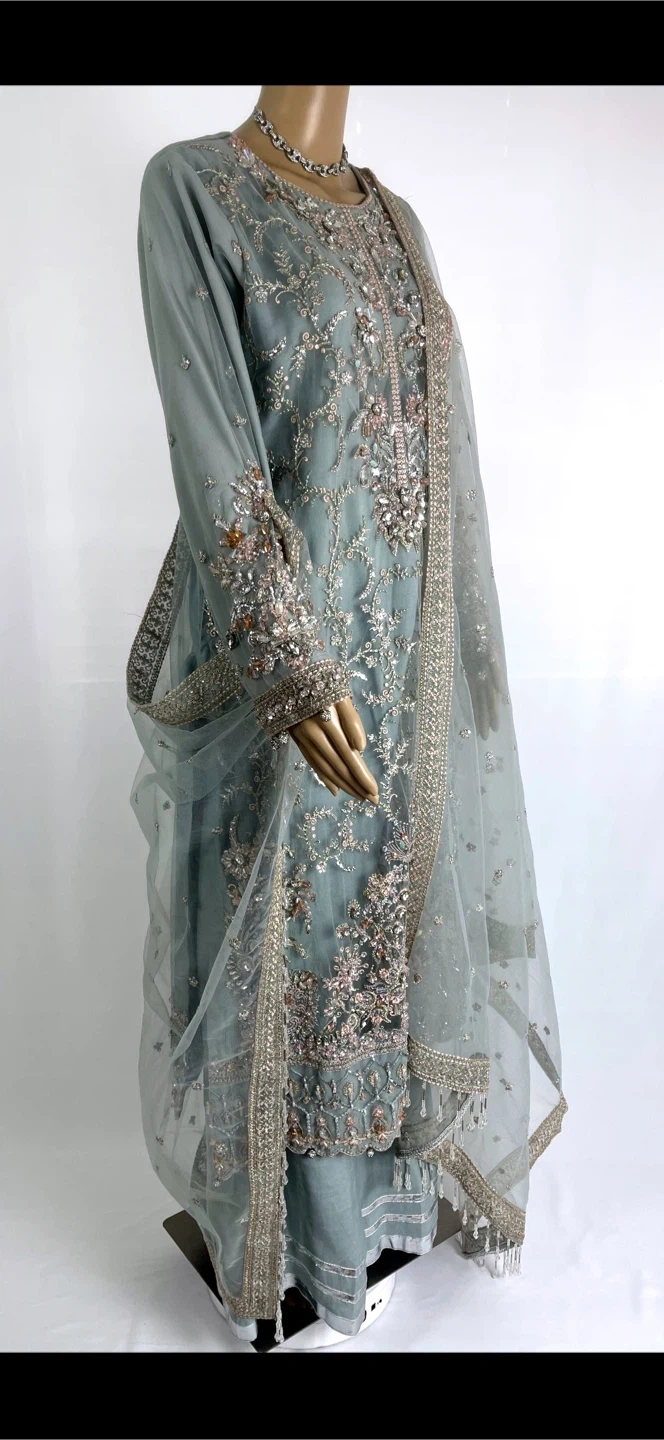 Beautifully embellished and heavy work with crystals, stones, beads, rhinestones, tilla and resham.