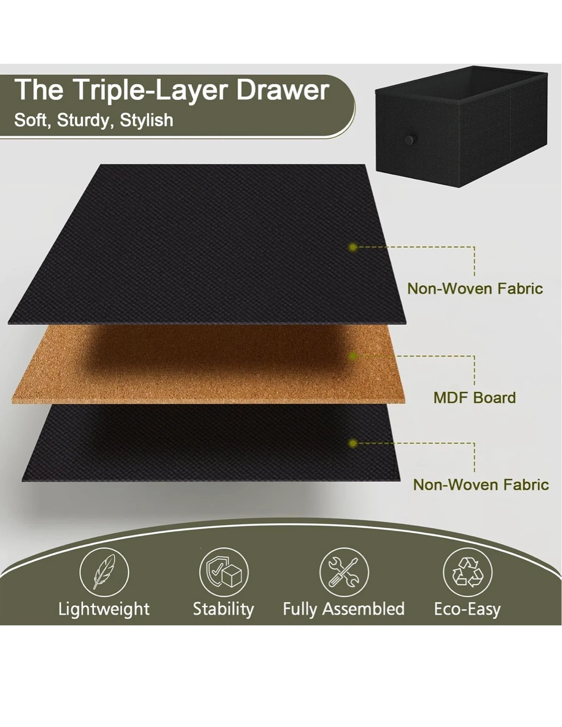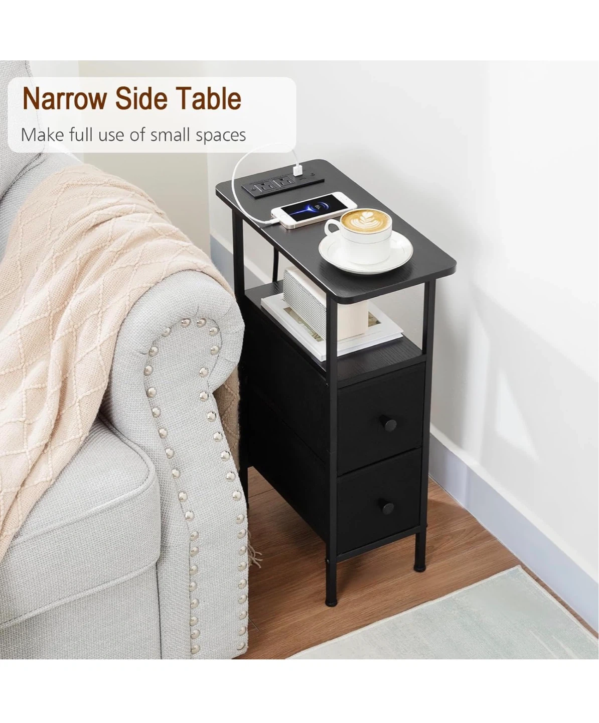 This narrow side table features two fabric drawers for storage. It includes 2 AC outlets and a USB port with a 4.9-foot power cord, making it convenient for charging devices. The table's compact design is ideal for small spaces.