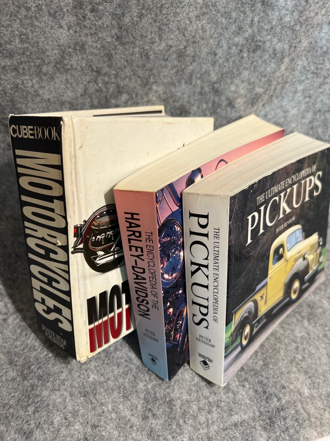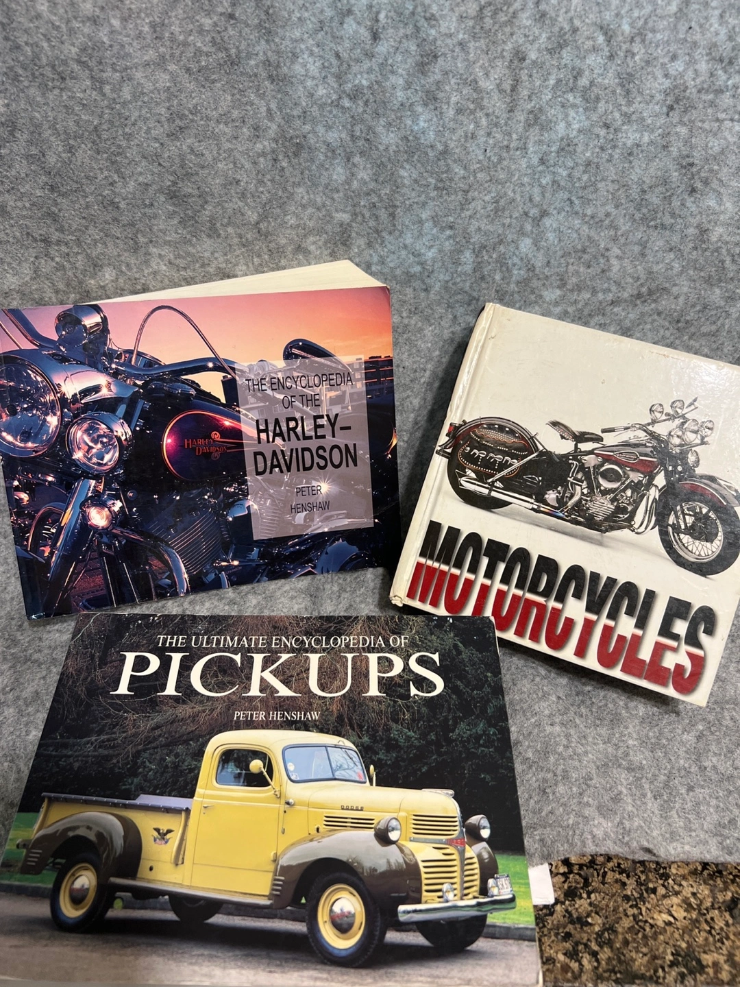 Selling a collection of automotive encyclopedias by Peter Henshaw. Includes titles such as "The Encyclopedia of the Harley-Davidson" and "The Ultimate Encyclopedia of Pickups". Great for any car or motorcycle enthusiast!