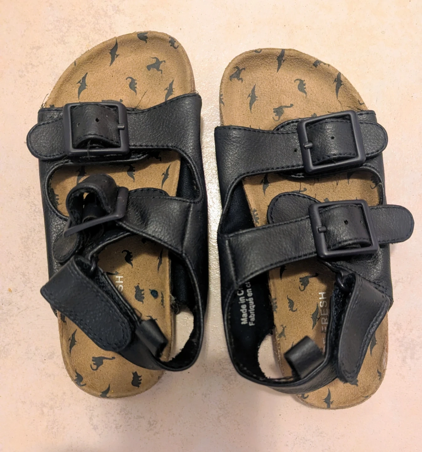 These black Refresh sandals feature a fun dinosaur print on the footbed. They have adjustable buckle straps for a secure fit. Great for little ones who love dinosaurs!