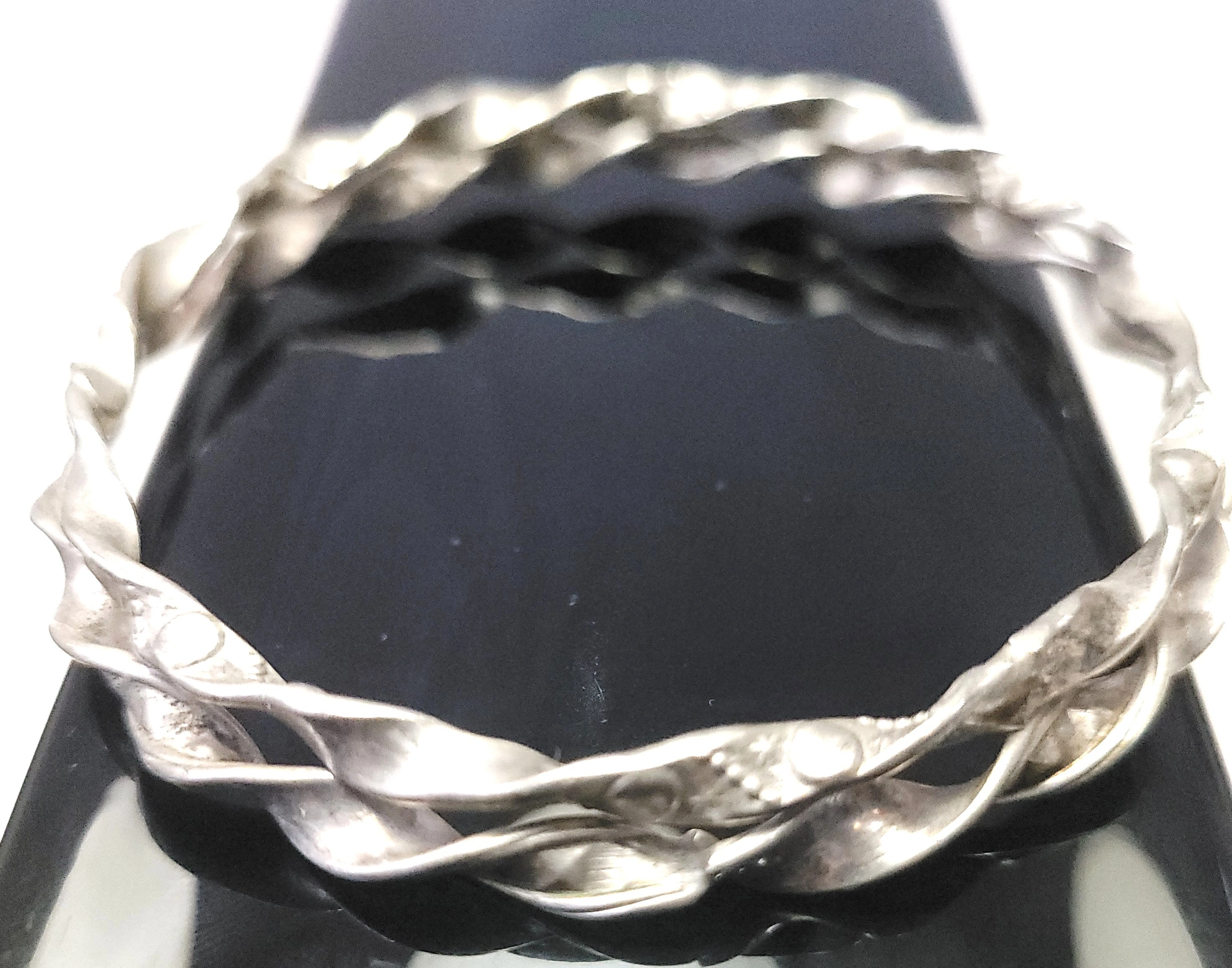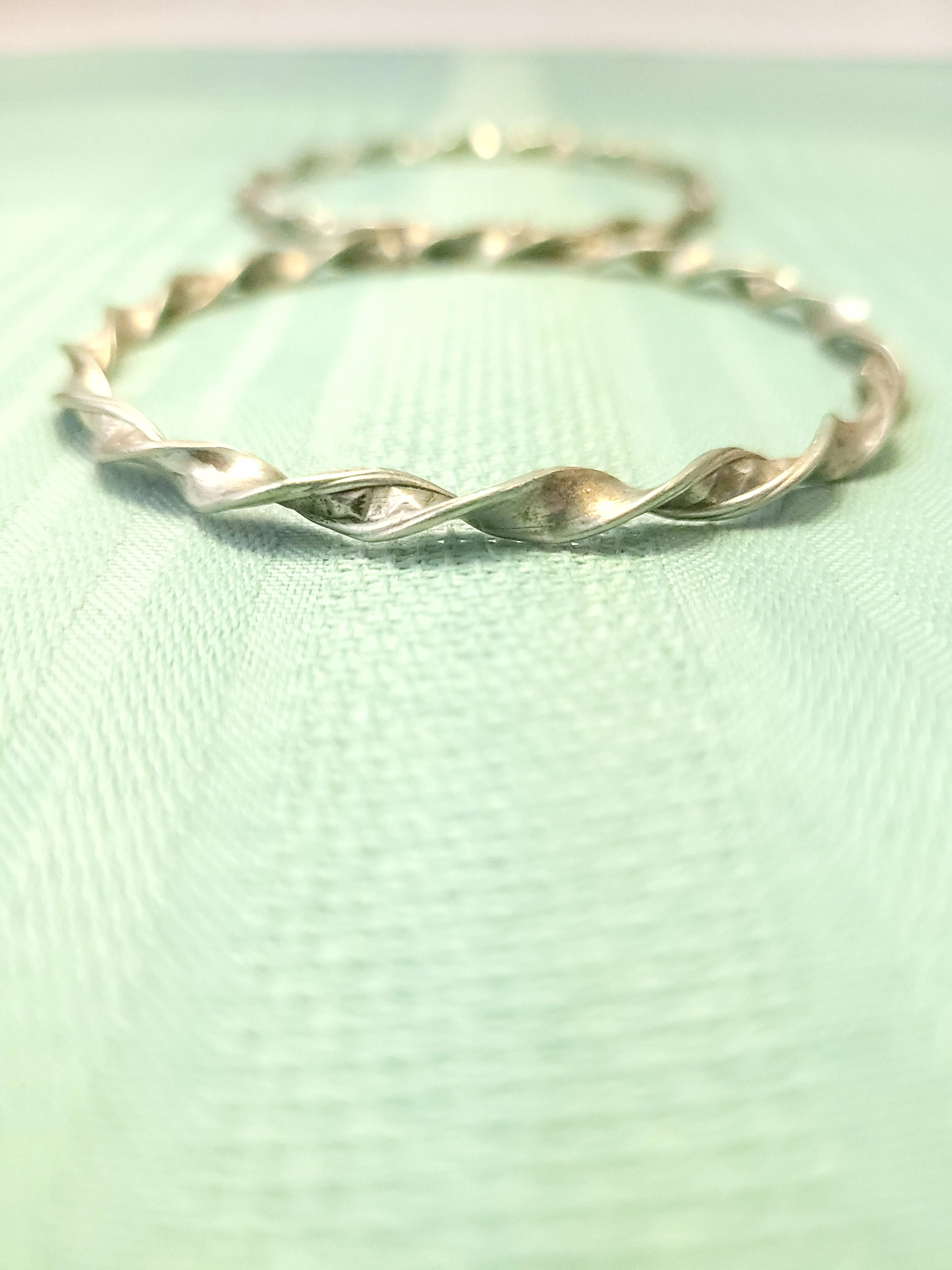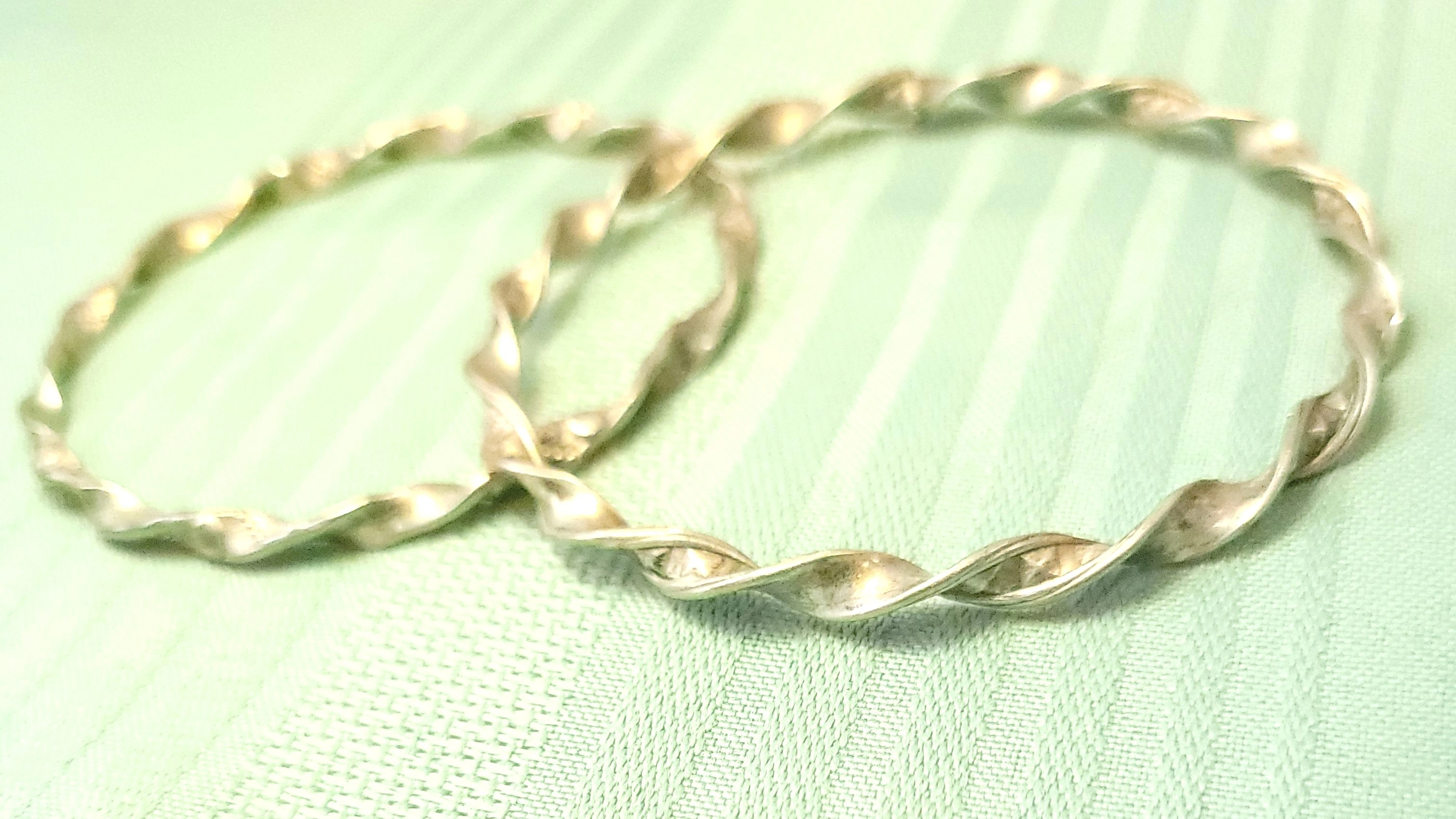 Set of two silver-tone bangles with a twisted ribbon design. These are solid, non-adjustable bracelets with a 7.5cm diameter, suitable for a medium to large wrist. The 4mm width makes them ideal for stacking.