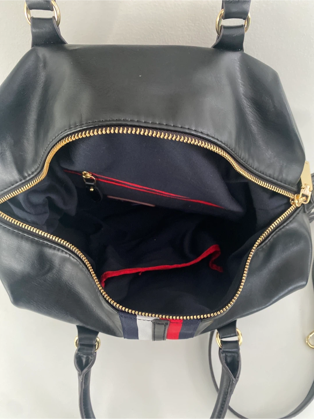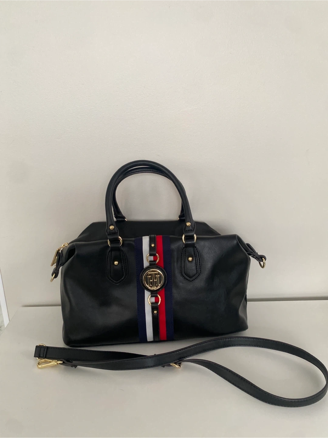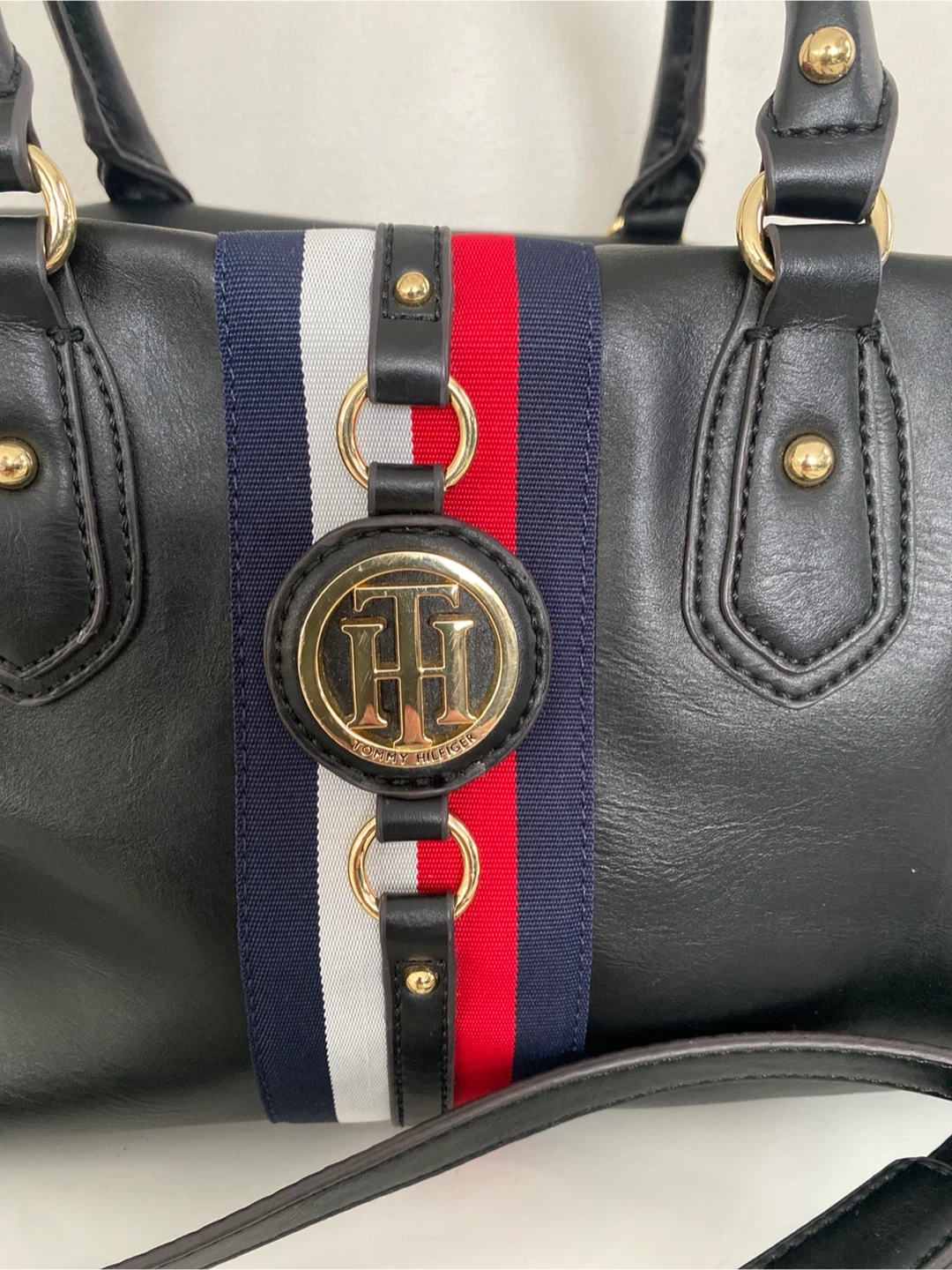 This is a black Tommy Hilfiger Bag . It features gold hardware and the brand's signature stripe detail. Includes both top handles and a detachable shoulder strap.