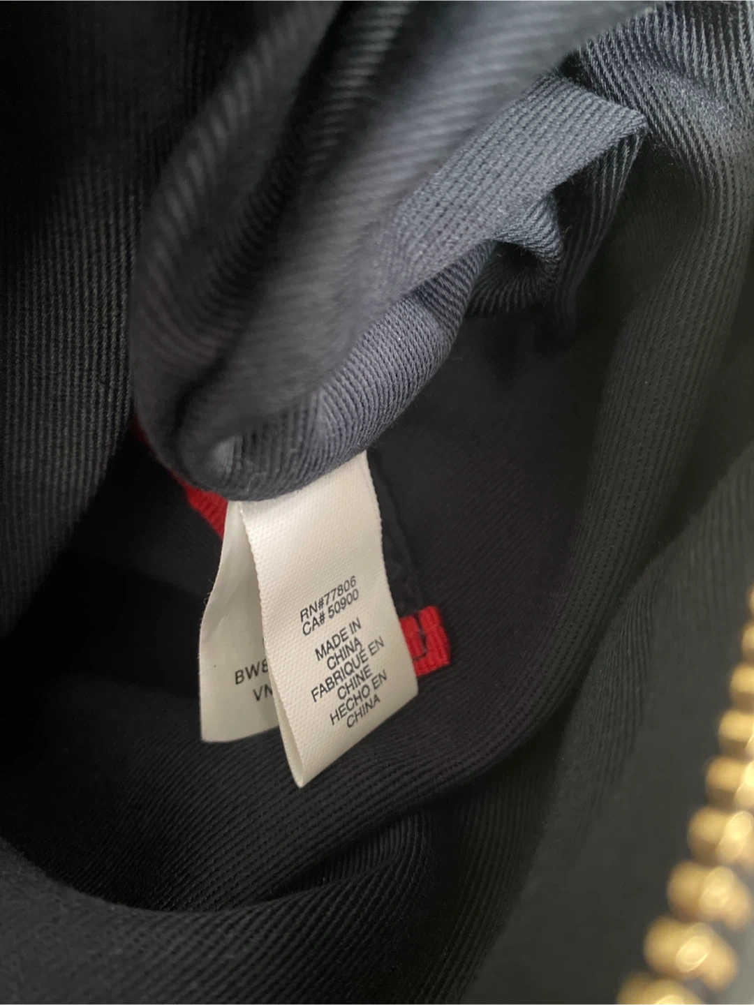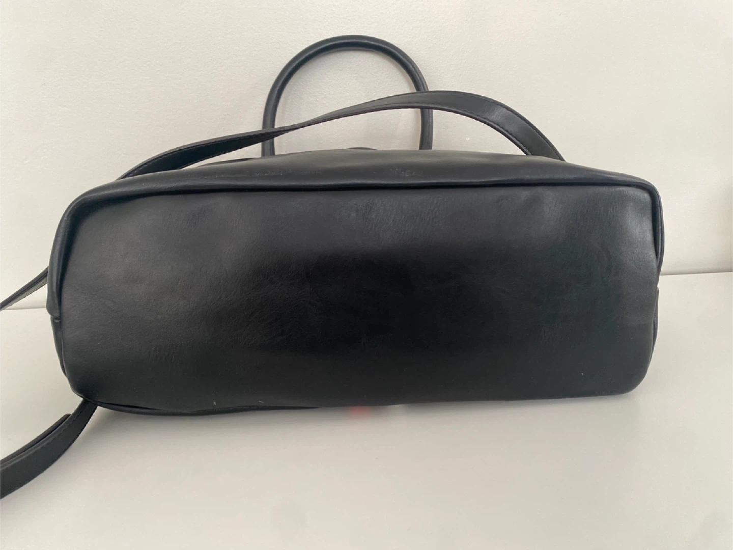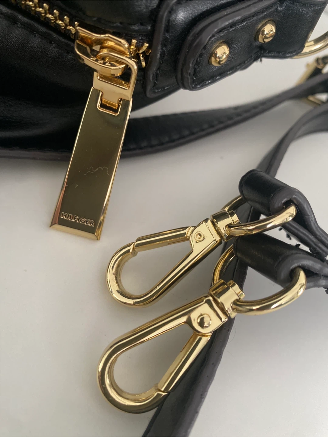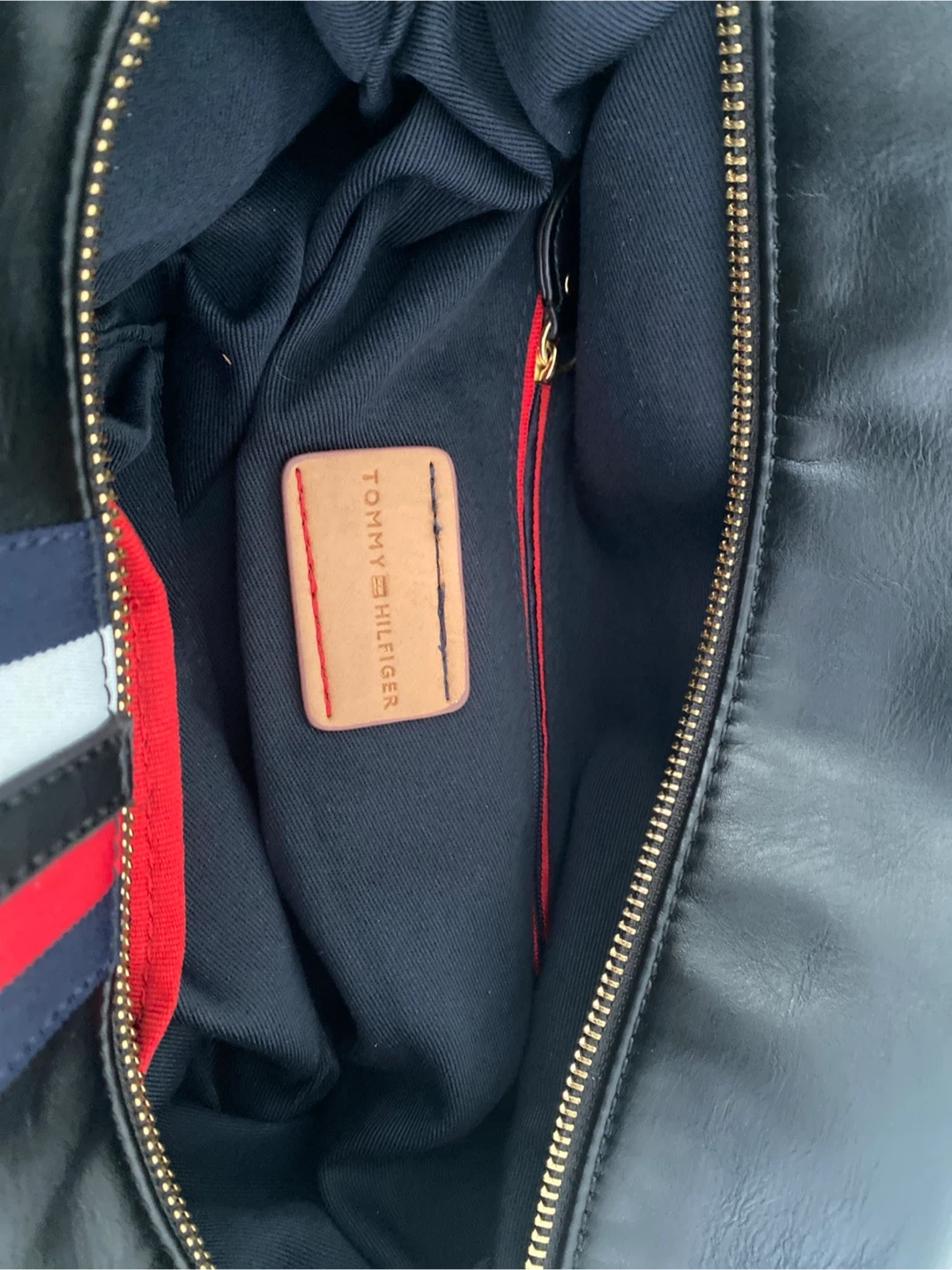 This is a black Tommy Hilfiger Bag . It features gold hardware and the brand's signature stripe detail. Includes both top handles and a detachable shoulder strap.