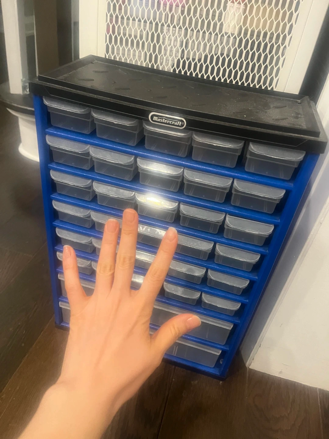 This Mastercraft storage cabinet has a blue frame with a black top and 30 clear plastic drawers. Perfect for organizing small items like hardware, craft supplies, or office essentials. Its compact size makes it suitable for a workshop, garage, or desk.