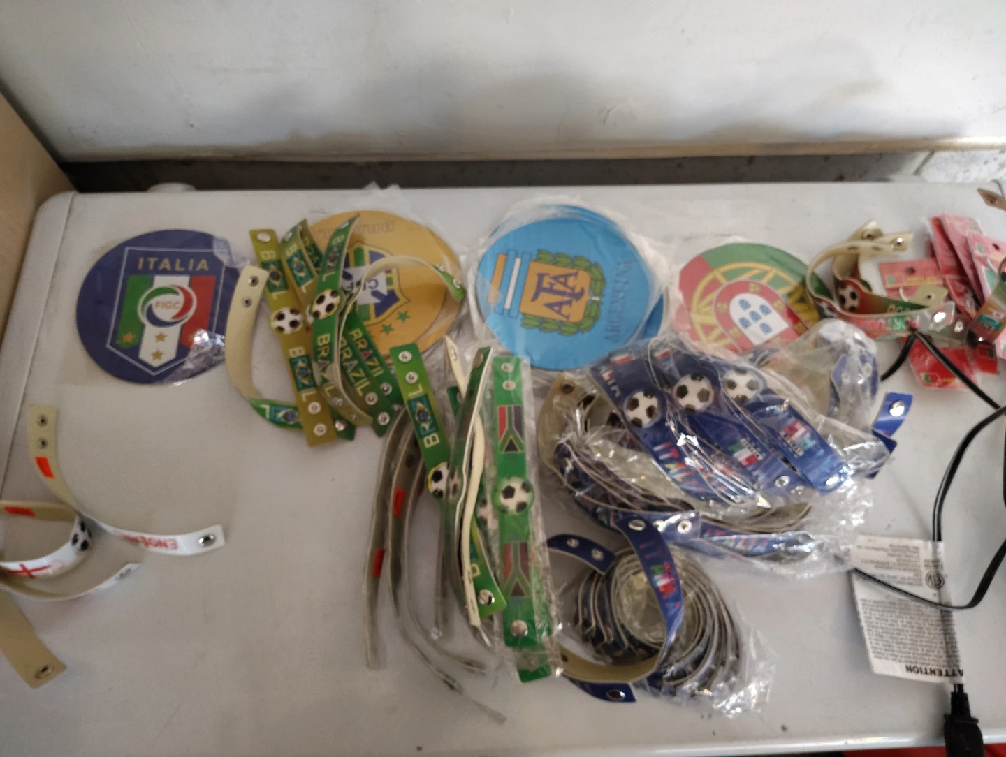 Collection of soccer fan bracelets and circular patches. Includes items representing Italia (FIGC), Brazil, Argentina (AFA), and Portugal. Great for any soccer enthusiast! Price per item. Open to offers for the whole lot.