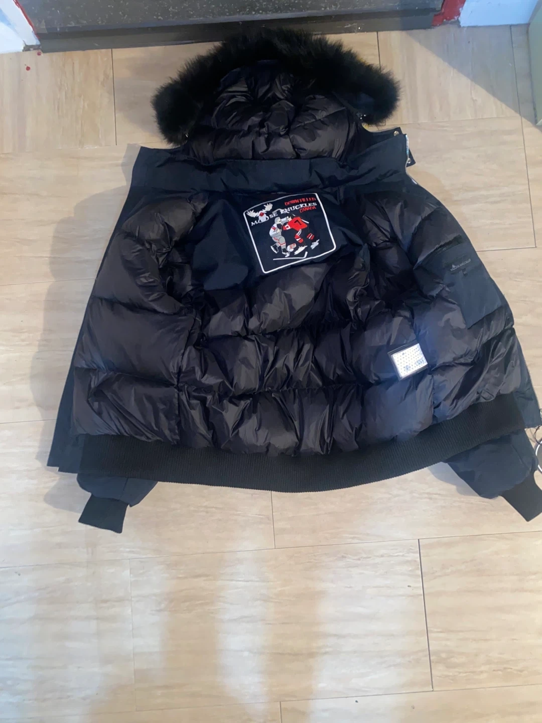 Selling a Moose Knuckles down bomber jacket. It's in great condition and ready for the cold weather. The jacket features a stylish design and is sure to keep you warm and look stylish while doing so