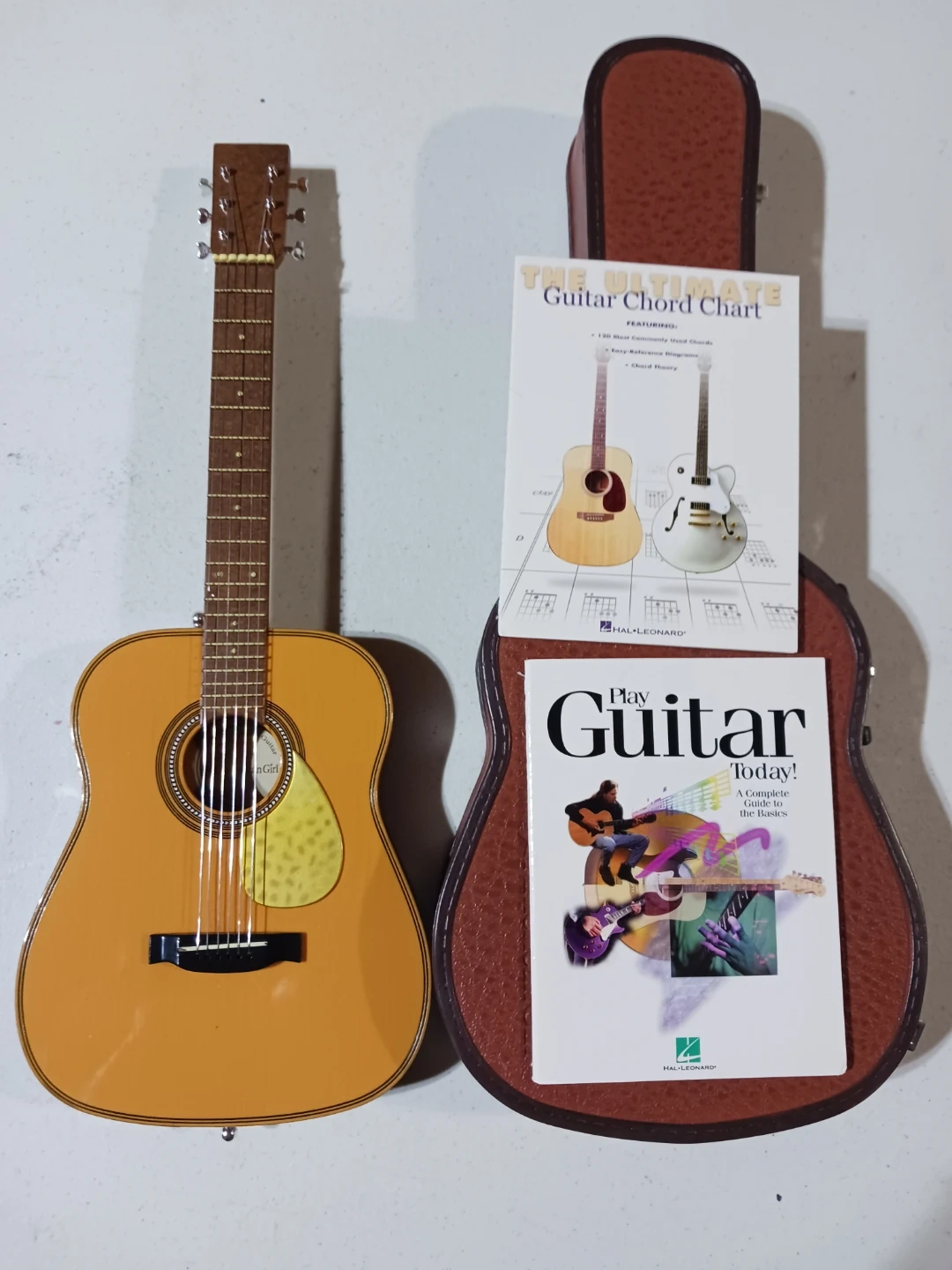 This is an acoustic guitar with a light wood finish and a yellow pickguard. It's accompanied by two Hal Leonard guitar books, "The Ultimate Guitar Chord Chart" and "Play Guitar Today!". The books cover chords and basic guitar guidance. The guitar measures about 12 inches in length. I only do pickup