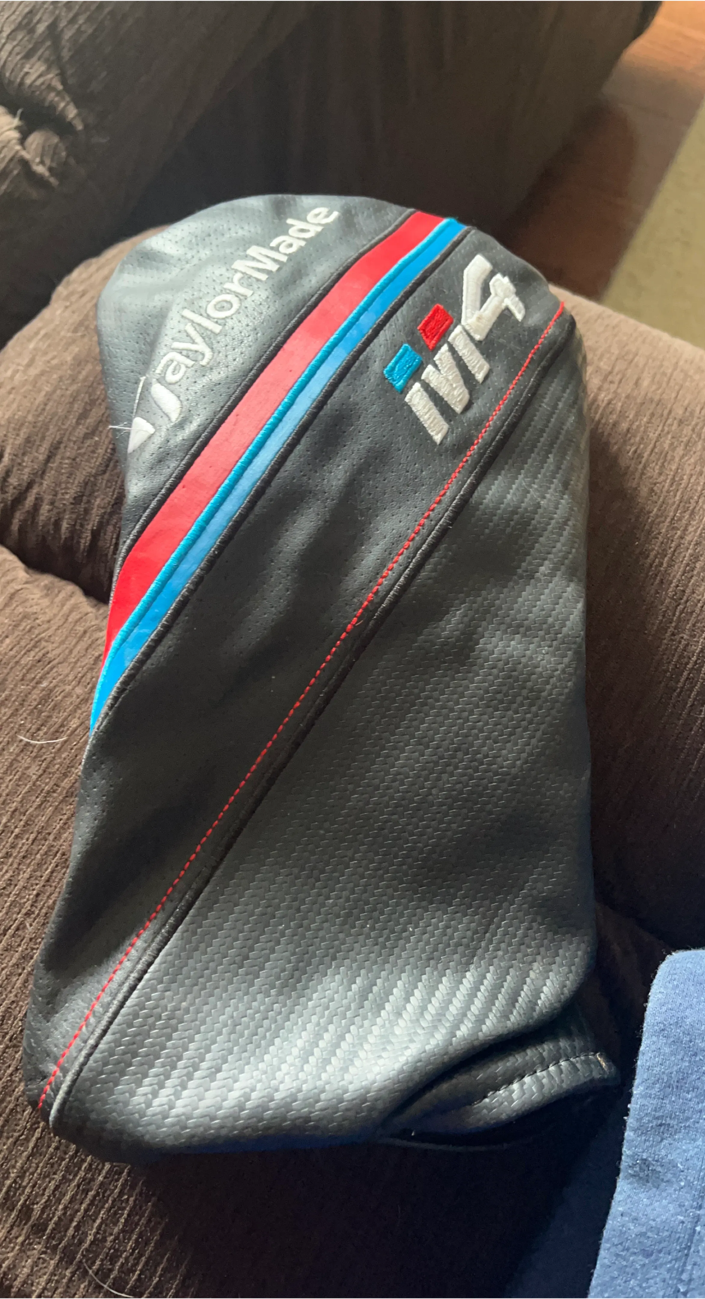 This is a TaylorMade M4 golf headcover. It's made of a black, carbon fibre-like material with red and blue accents. Protects your golf club with style!