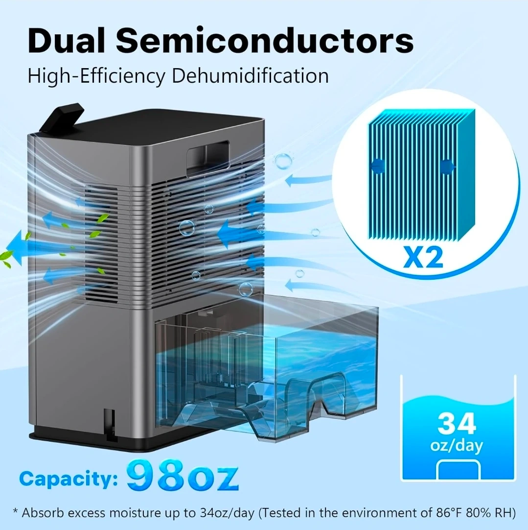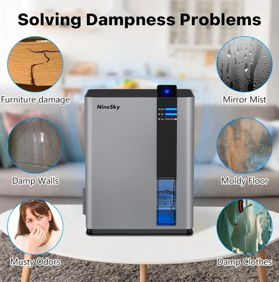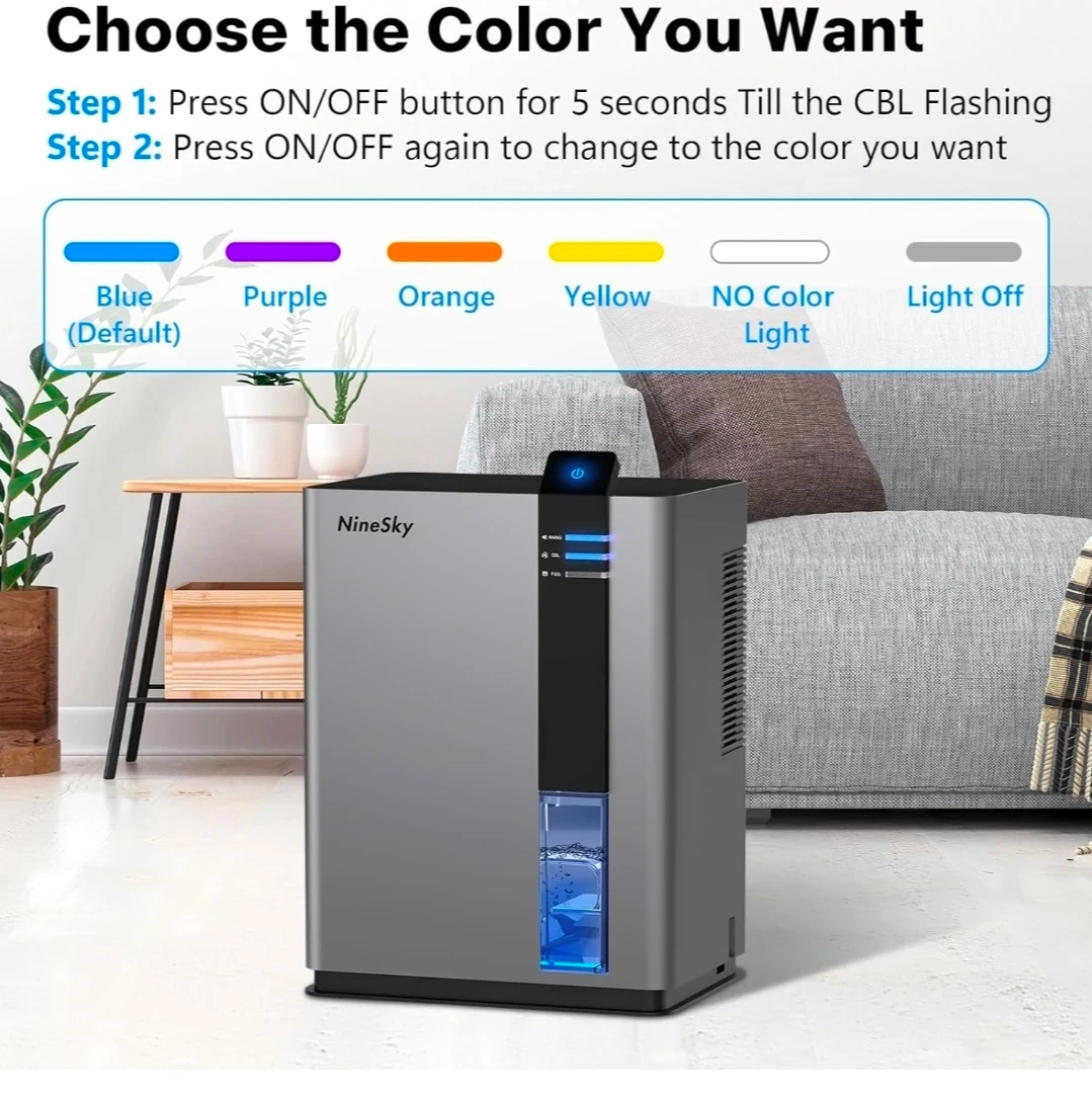 NineSky portable dehumidifier with a 98oz capacity. It absorbs up to 34 oz/day and features auto shut-off protection. This unit has a portable handle and organized design for easy placement. It can also change light colours! Dual semiconductors for high-efficiency dehumidification.