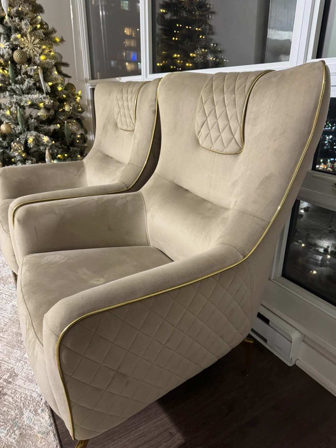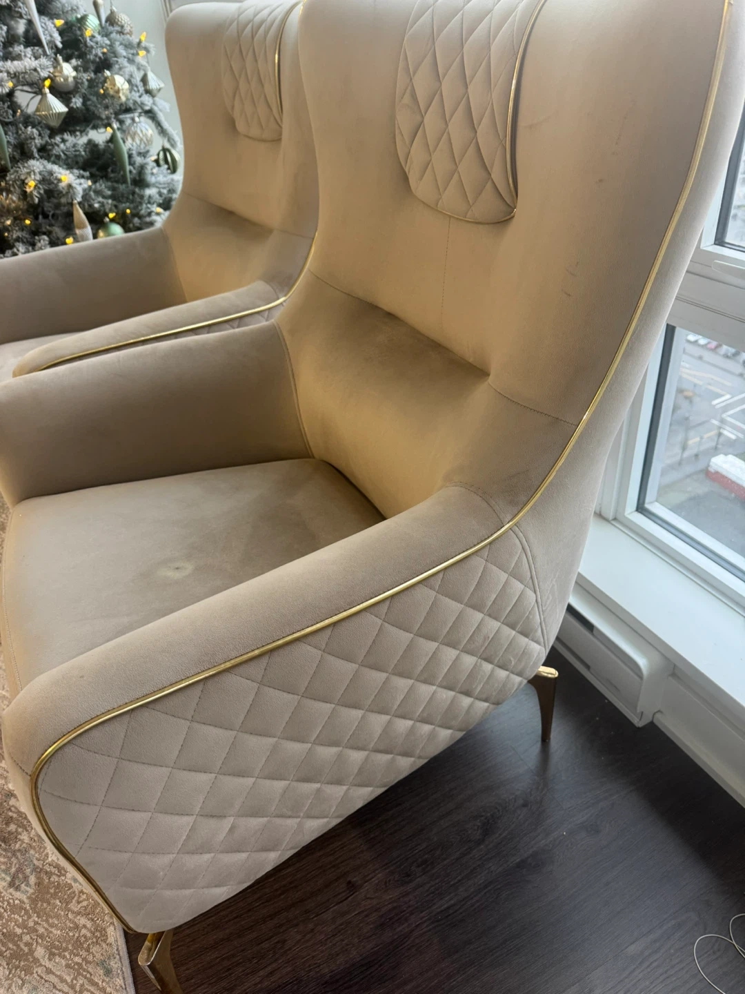 Selling a set of two high-quality beige accent chairs.