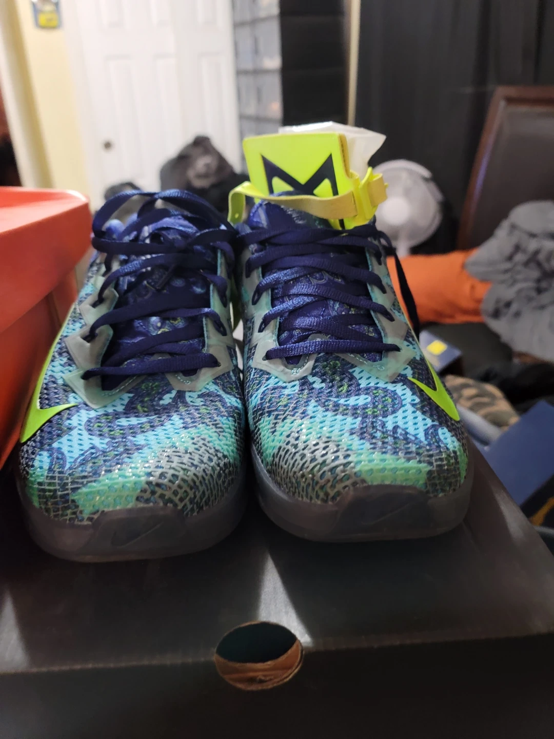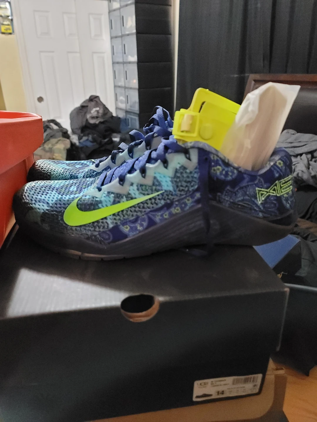 These Nike Metcon 8 training shoes feature a blue, green, and yellow patterned design. They're built for performance and stability during workouts. No box