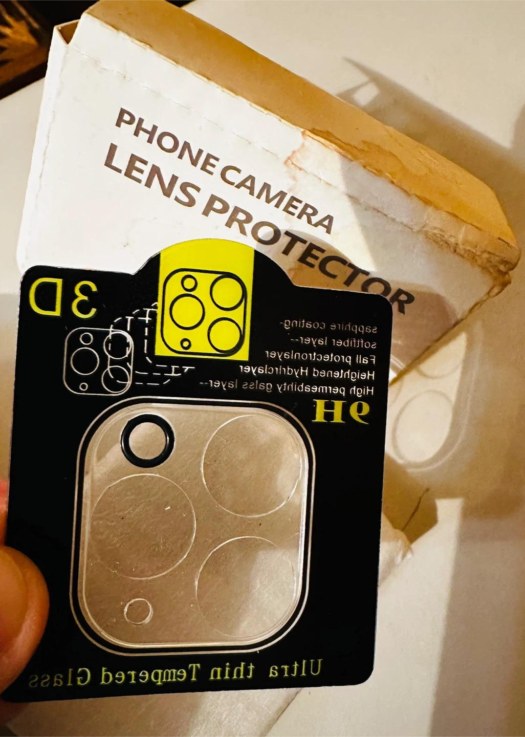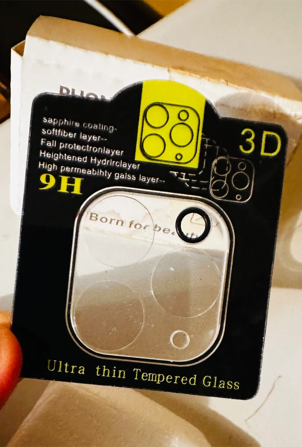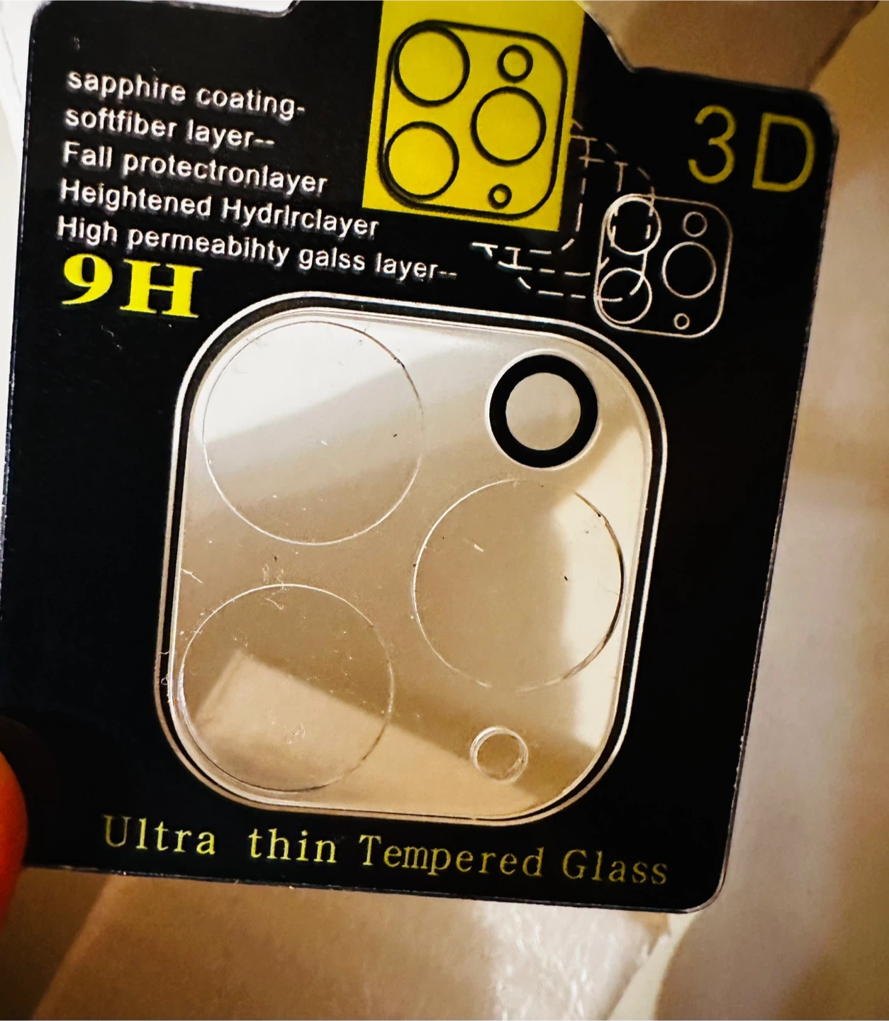 This is a phone camera lens protector made with ultra-thin tempered glass. It features a sapphire coating, softfiber layer, fall protection layer, and a heightened Hydrirclayer for high permeability. It's 9H hardness rated.