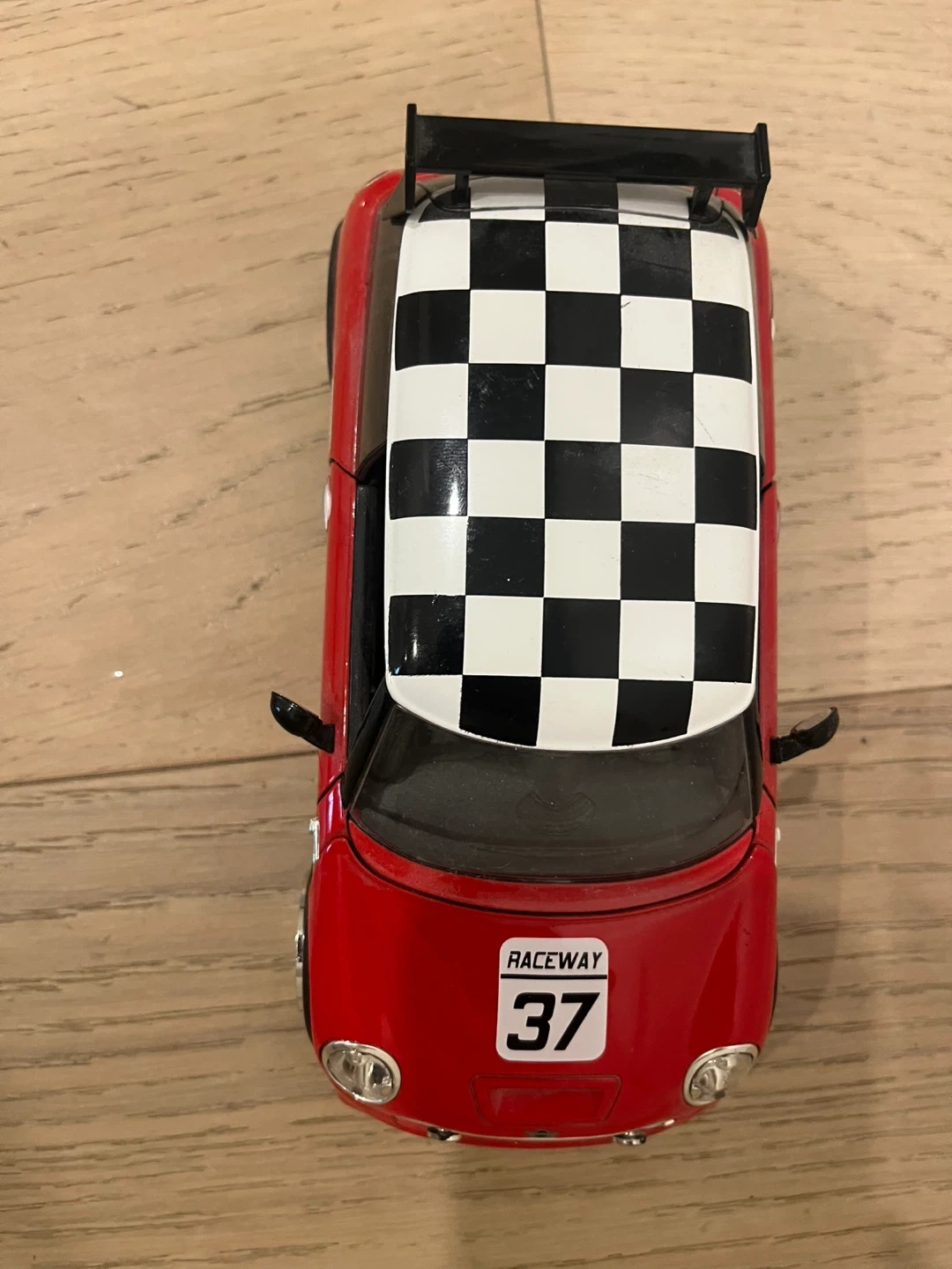 This is a red diecast model of a Mini Cooper, styled for racing with a checkered roof and "37" decals. The doors and hood open to reveal interior details. It's a detailed replica for collectors or playtime.