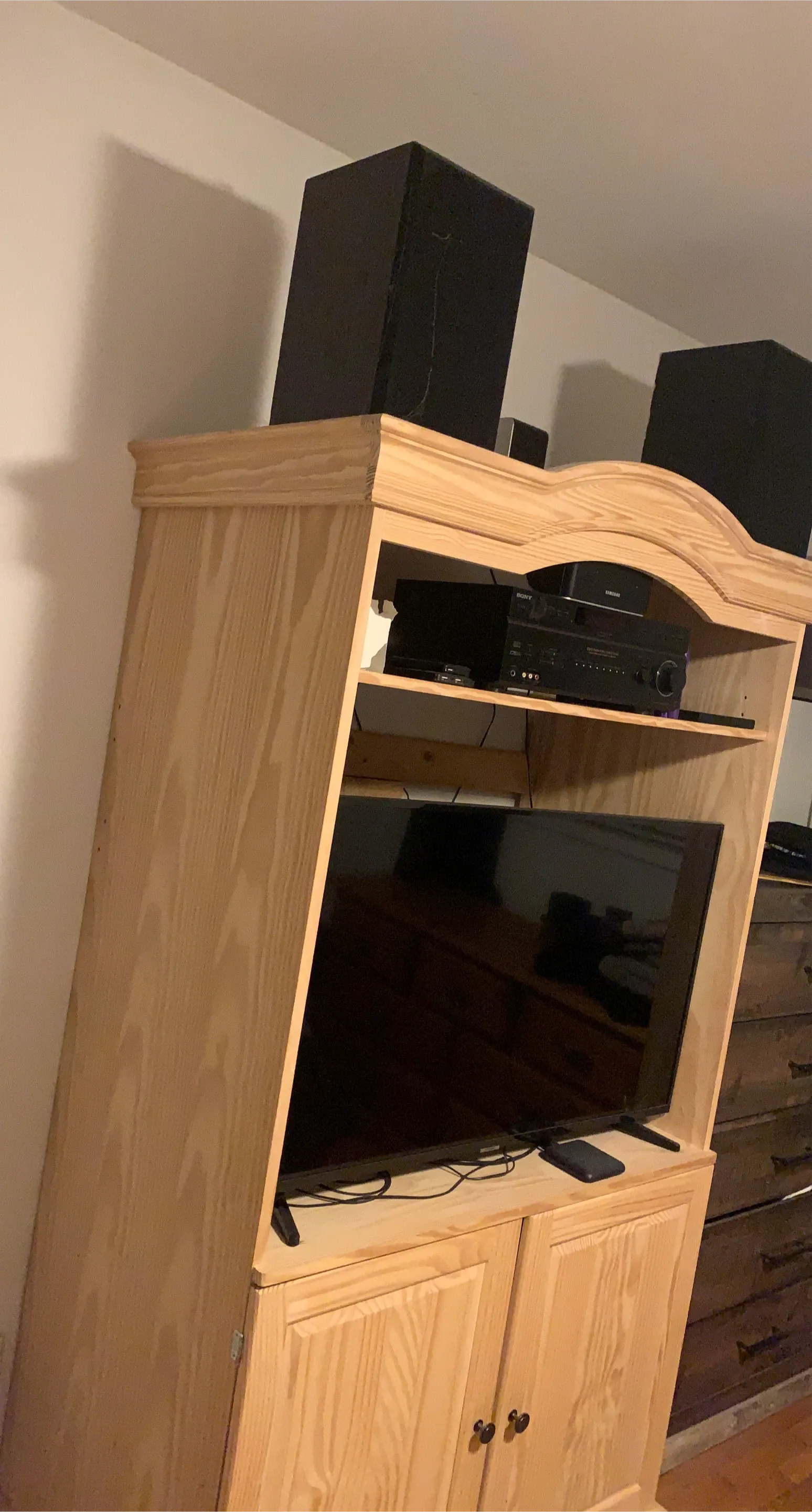 Selling a wooden entertainment center. It features multiple shelves and cabinet space for storage. Perfect for organizing your living room or entertainment area!