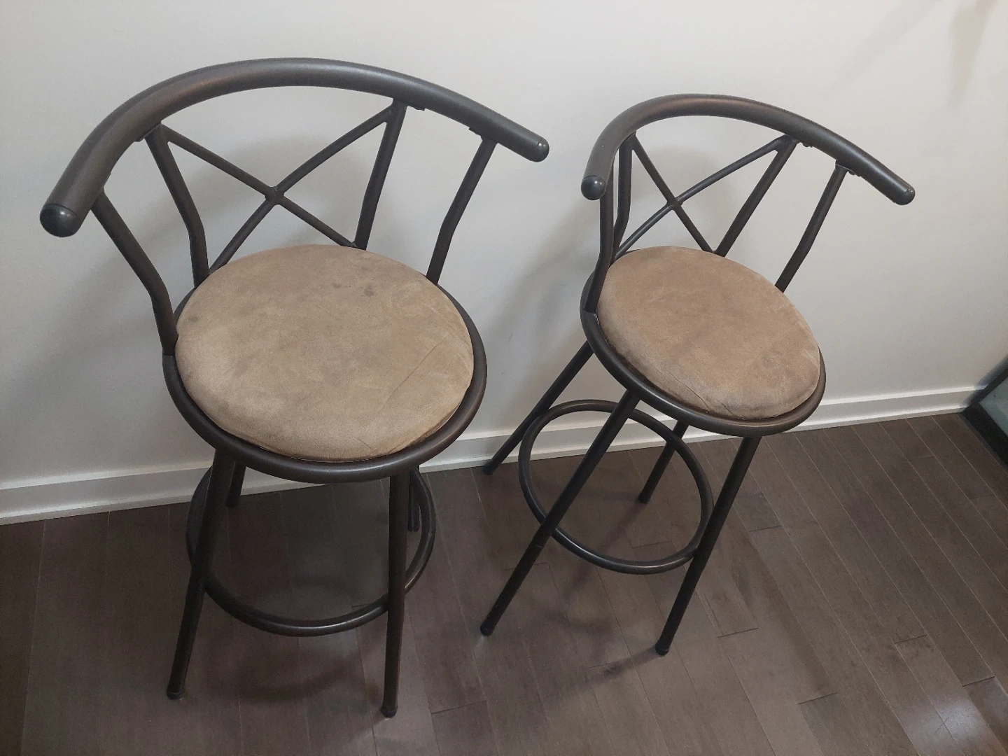 Selling a set of two swivel bar stools. They have a brown metal frame with a tan padded seat. They are in good condition and would be a great addition to any kitchen or bar area