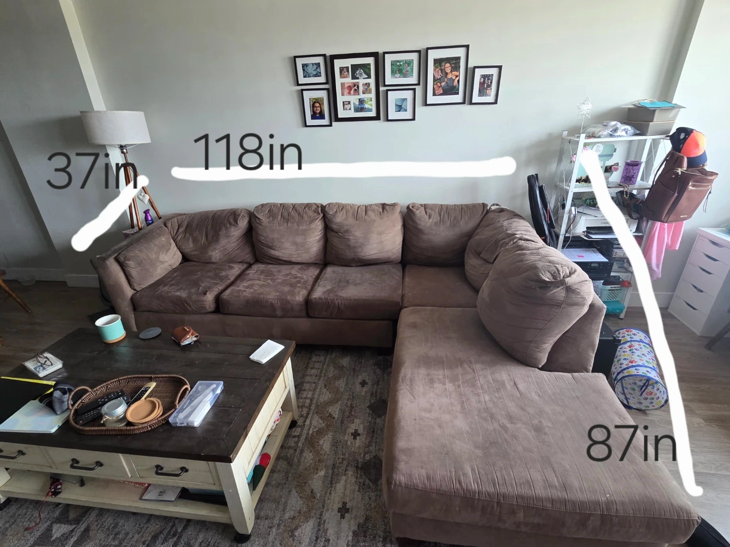 A comfy sectional sofa, perfect for lounging. It's a rich brown colour with plush cushions. The main sofa section is 118 inches long and 37 inches deep. The chaise portion measures 87 inches.