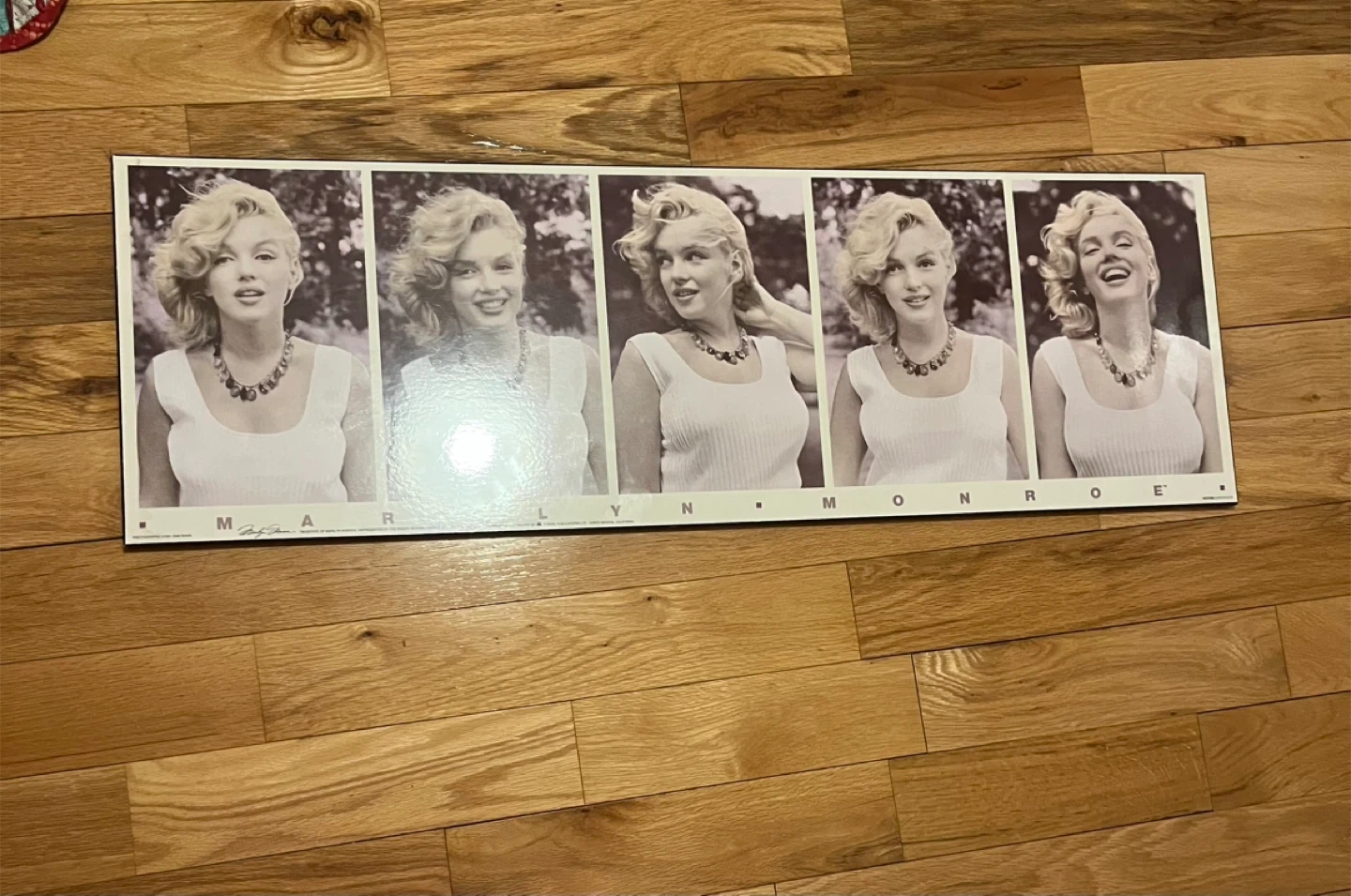 Features five distinct black and white photos of Marilyn Monroe. This poster showcases classic images of the iconic star. It's a great piece for any fan's collection.