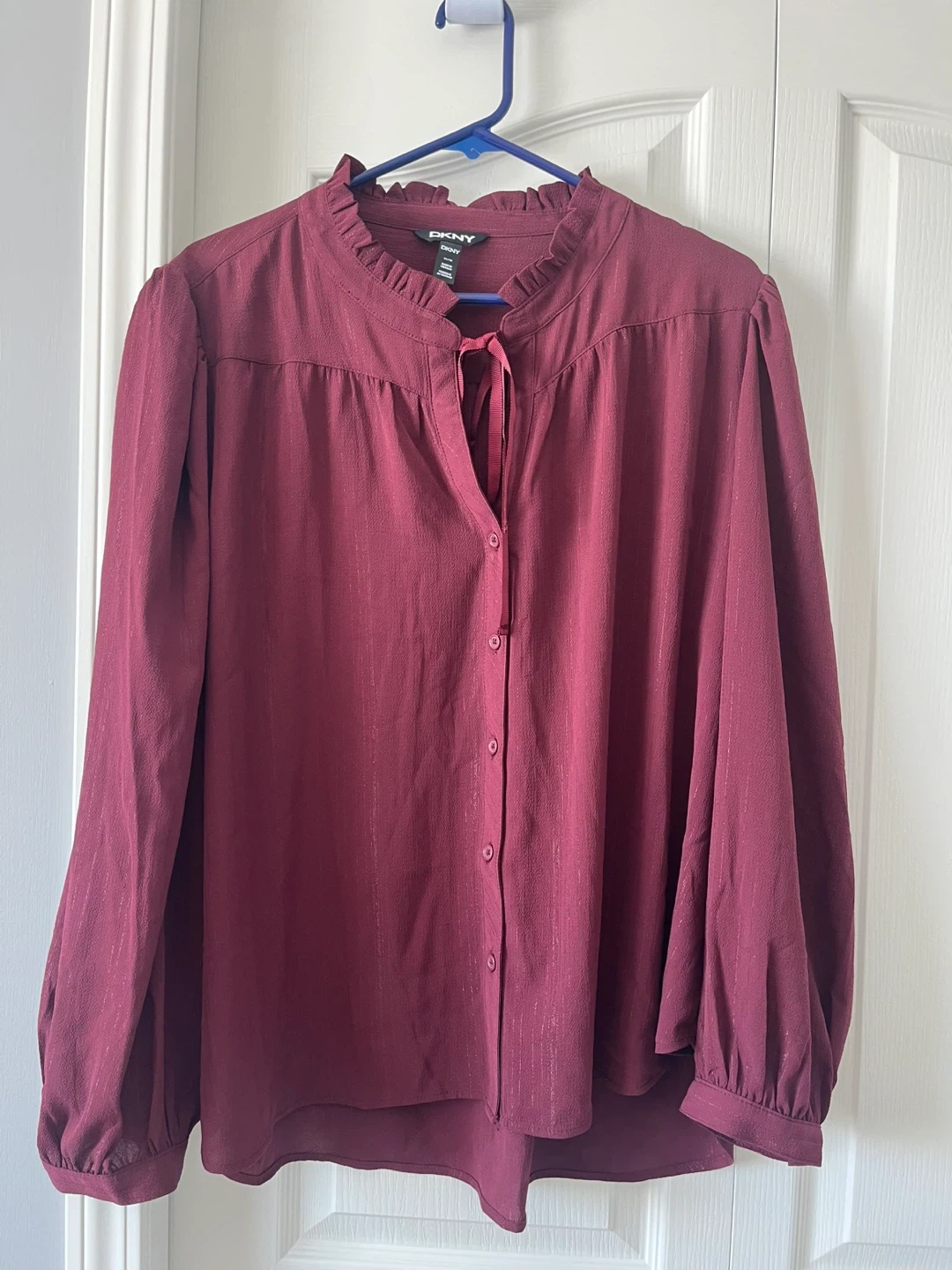 DKNY burgundy blouse with a ruffled neckline and tie detail. It's a size XX-Large. Long sleeves with elastic cuffs. Never worn