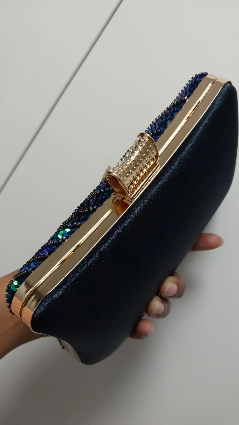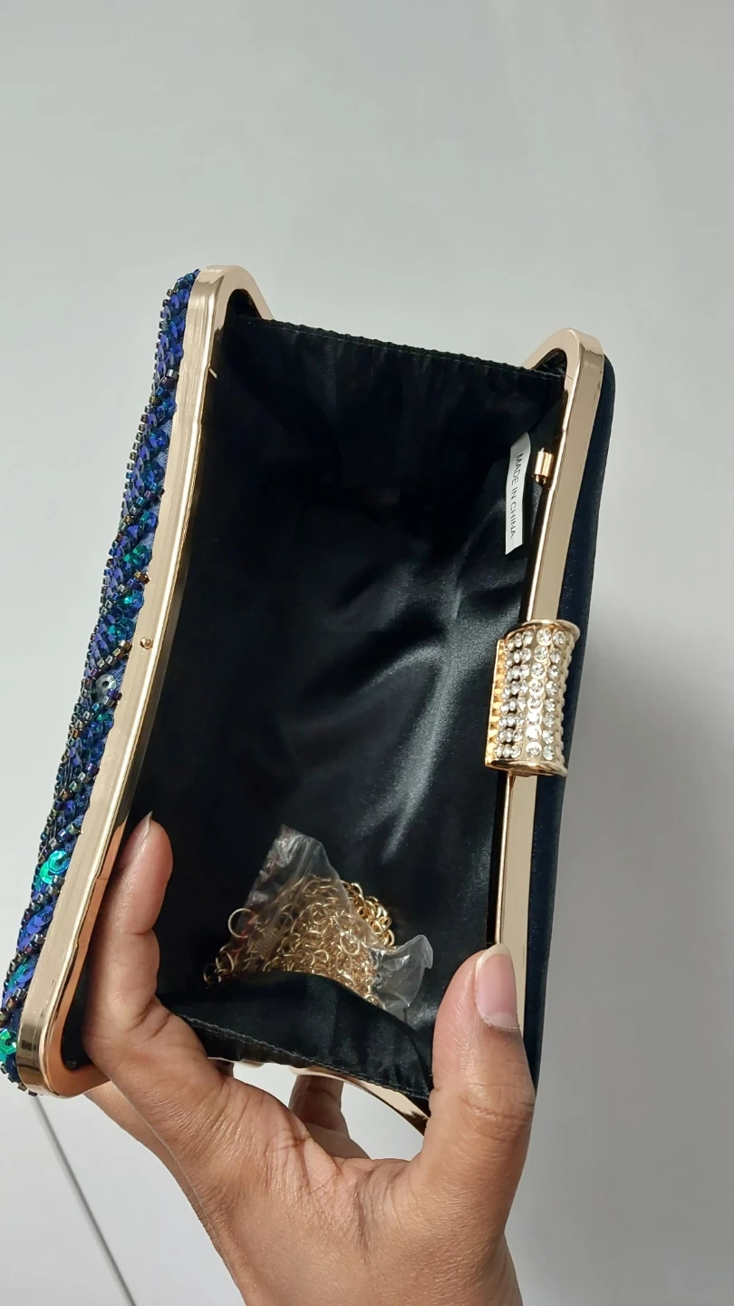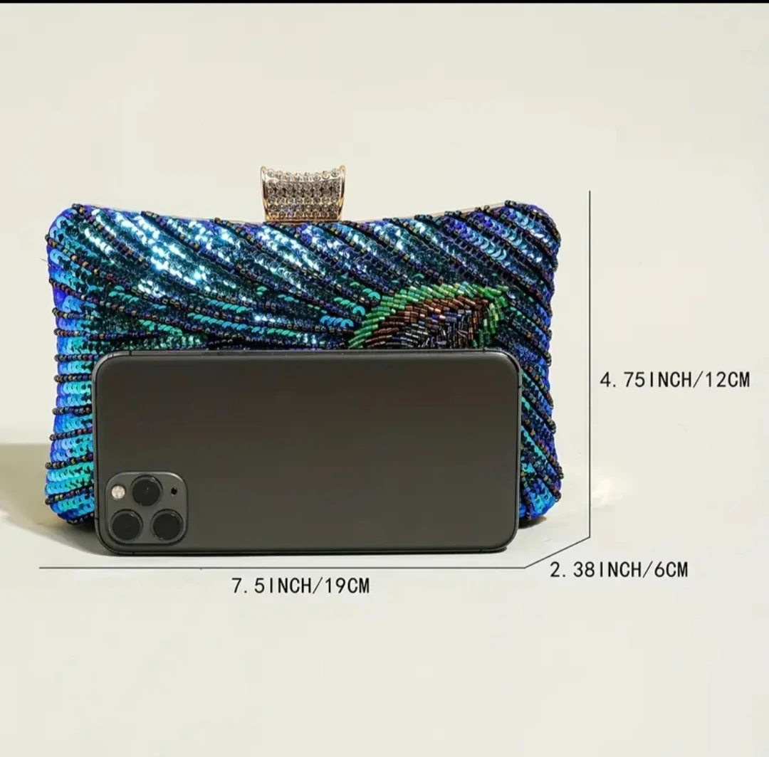 This eye-catching clutch is adorned with vibrant sequins in a peacock feather design. It's the perfect accessory to add a touch of sparkle to your evening look! It also comes with a chain.