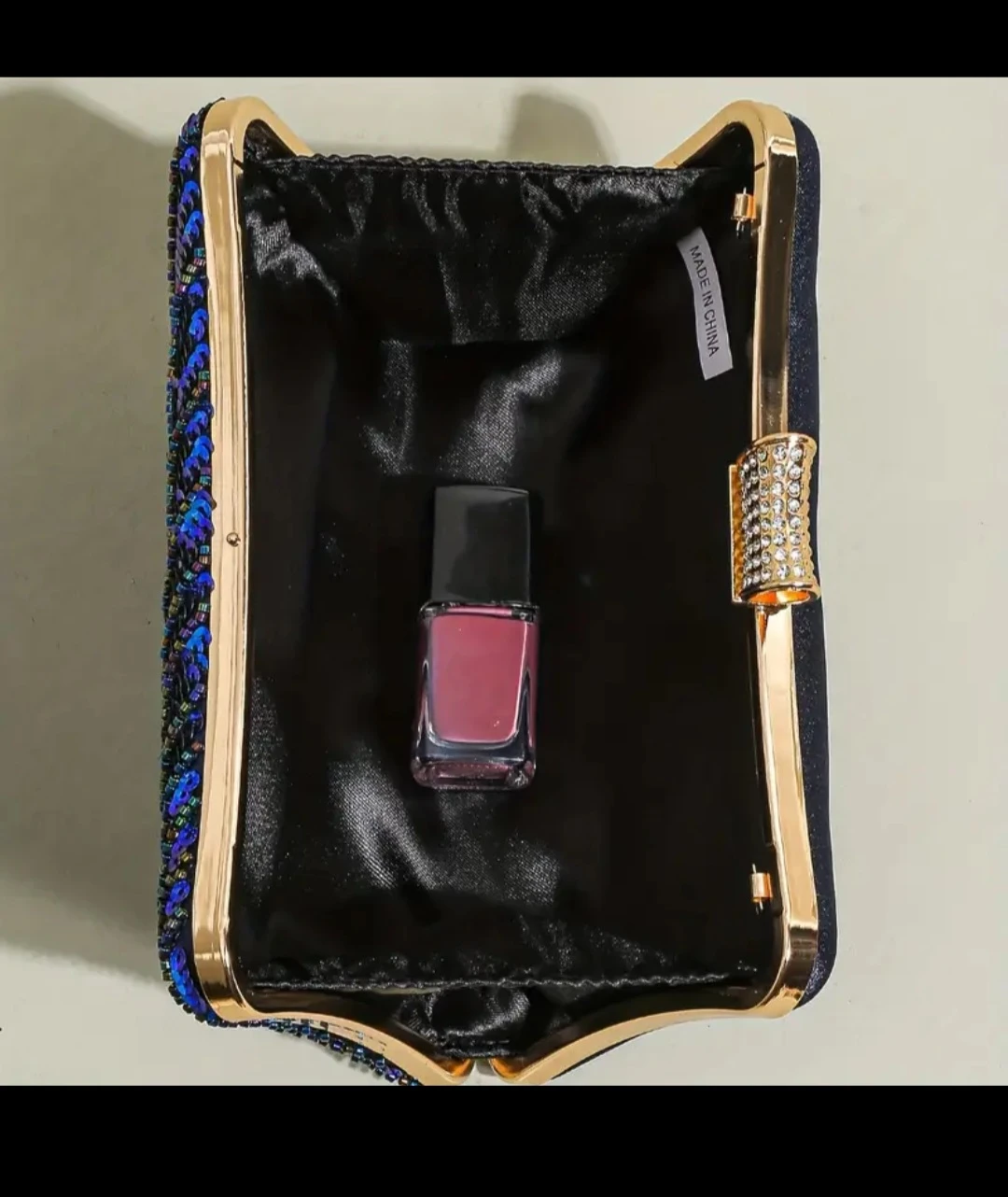 This eye-catching clutch is adorned with vibrant sequins in a peacock feather design. It's the perfect accessory to add a touch of sparkle to your evening look! It also comes with a chain.