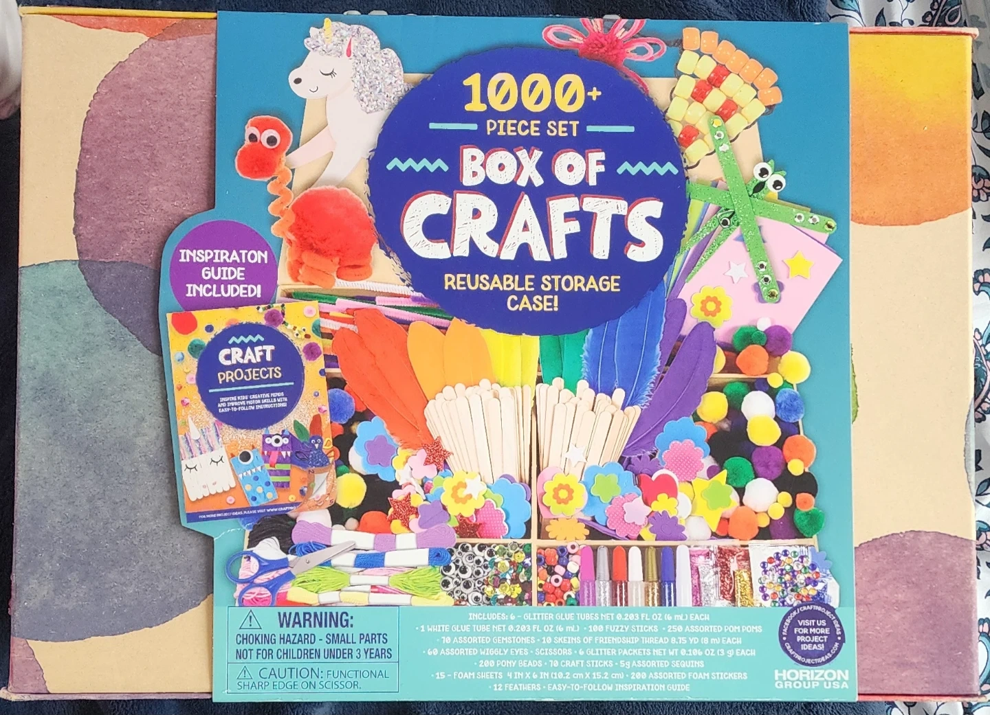 This is a 1000+ piece craft set in a reusable storage case! It includes glitter glue tubes, fuzzy sticks, pom poms, gemstones, friendship thread, wobbly eyes, scissors, glitter packets, pony beads, craft sticks, sequins, foam sheets, foam stickers, and feathers. An inspiration guide is also included.