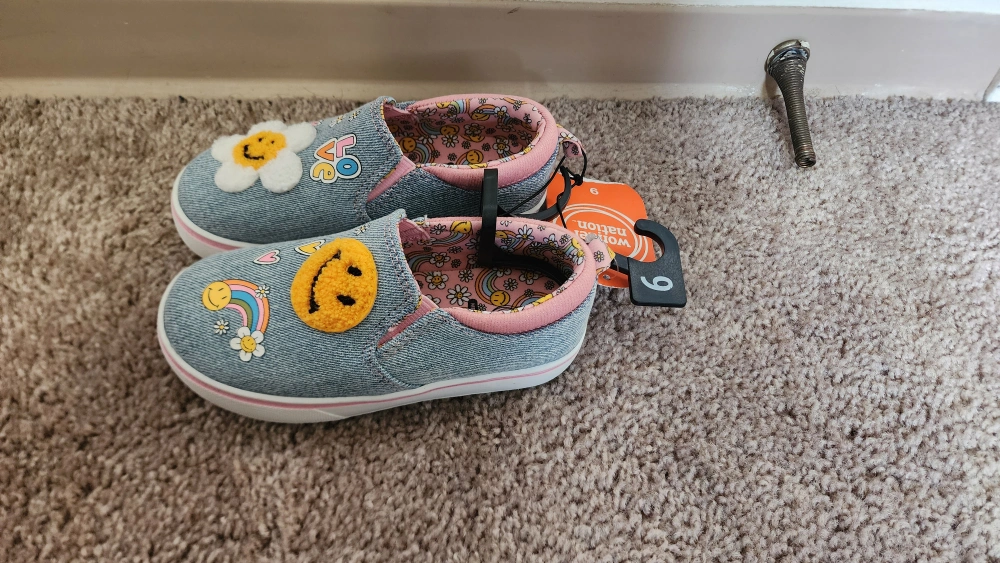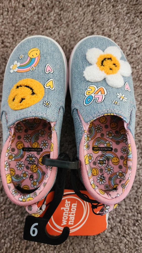 These Wonder Nation shoes are brand new and super cute! They're a size 9 and feature fun designs like a smiley face, rainbow, flower, and the word 'love'. Perfect for your little one!