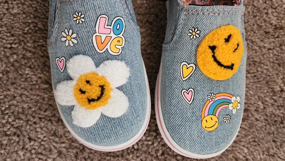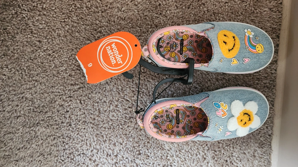 These Wonder Nation shoes are brand new and super cute! They're a size 9 and feature fun designs like a smiley face, rainbow, flower, and the word 'love'. Perfect for your little one!
