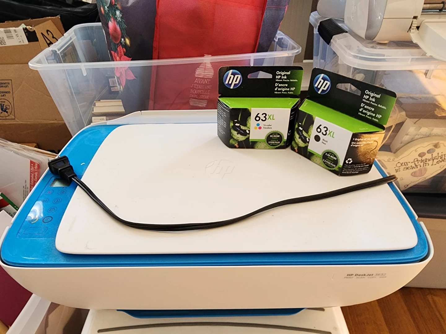 This is an HP DeskJet 3632 all-in-one printer. It comes with two HP 63XL ink cartridges, one tri-colour and one black. These high-yield cartridges offer more prints than standard ones. It's great for home or small office use!