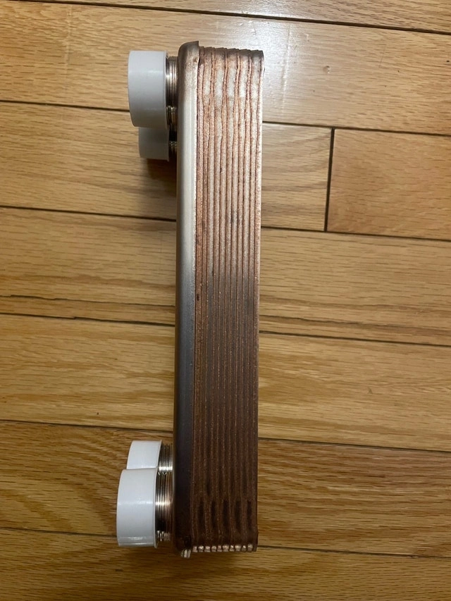 It has a lightweight and compact design for easy installation and service. Made of stainless steel 316L, brazed with 99.9% copper, and has 3/4" male fittings. Capacity ranges from 60,000 - 80,000 Btu/hr. This product has a 1 year warranty against manufacturer defects and is UL listed. Price firm. Pickup can be arranged in Brampton, Mississauga, Oakville, Burlington, Hamilton