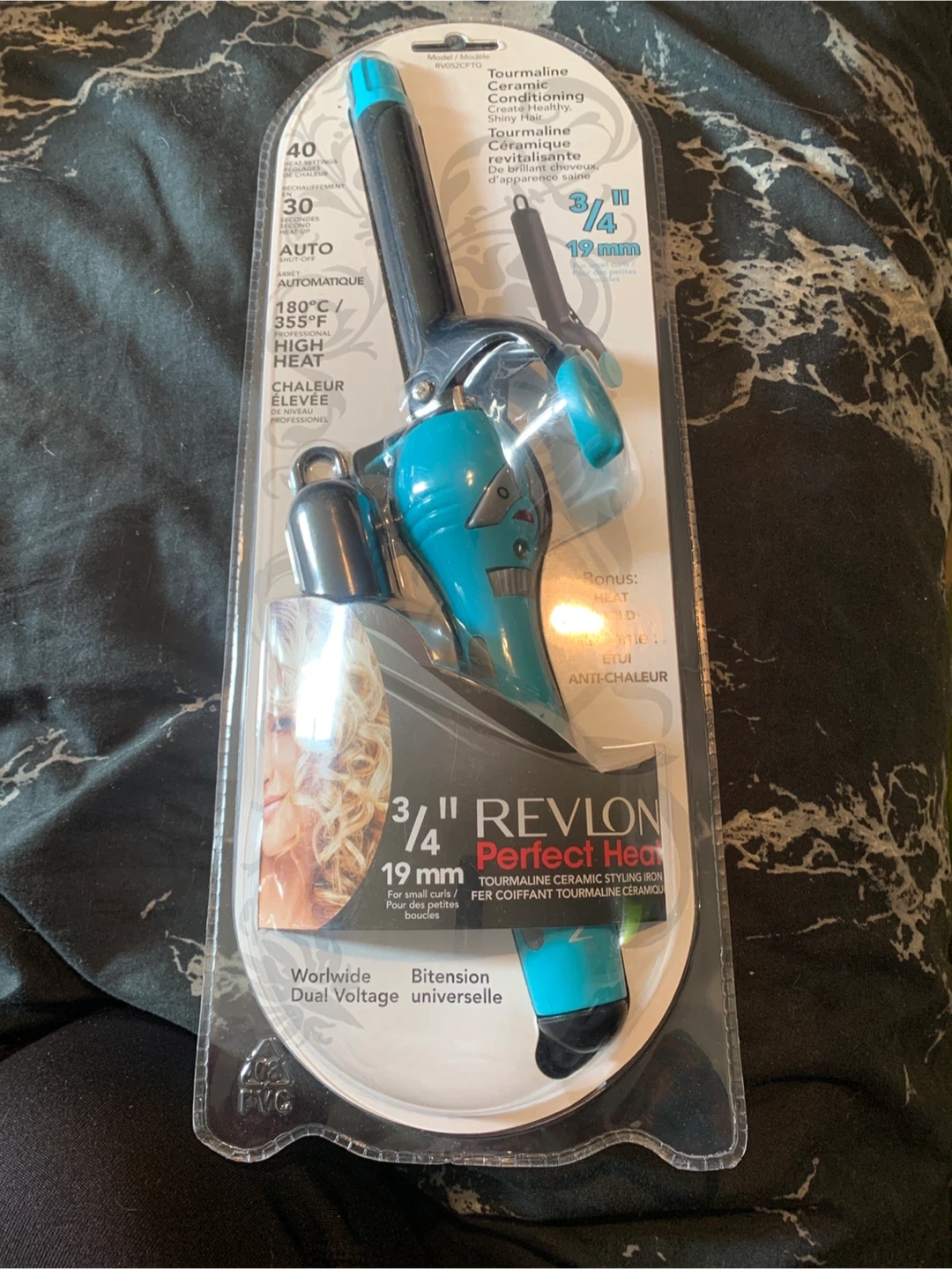 Selling a brand new Revlon Perfect Heat 3/4" curling iron! It features tourmaline ceramic conditioning for healthy, shiny hair. It heats up in 30 seconds and has an auto shut-off function for safety. It also has 40 heat settings, and high heat for professional results. Dual voltage for worldwide use, perfect for travel