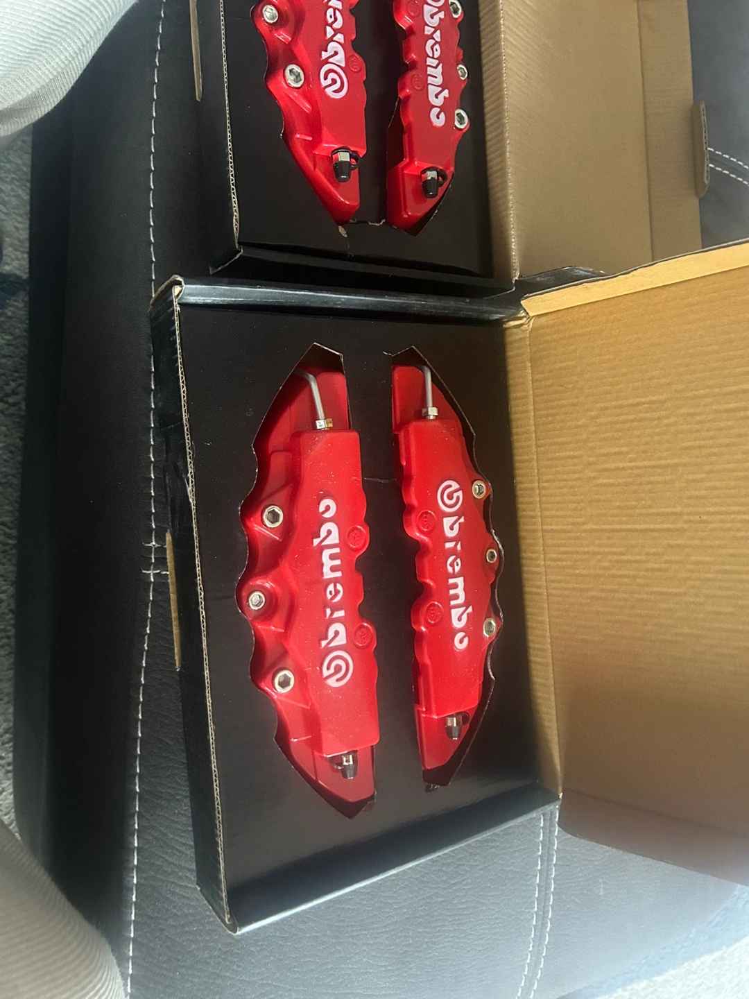 Two pairs of brand new Brembo red brake calipers. High-performance upgrade. Suitable for various vehicles. Originally packaged.
