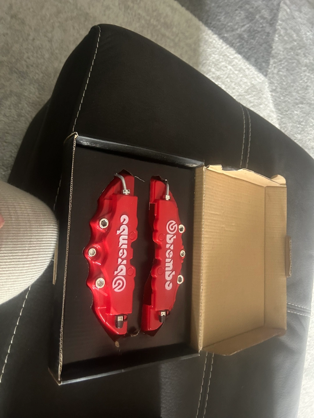 Two pairs of brand new Brembo red brake calipers. High-performance upgrade. Suitable for various vehicles. Originally packaged.