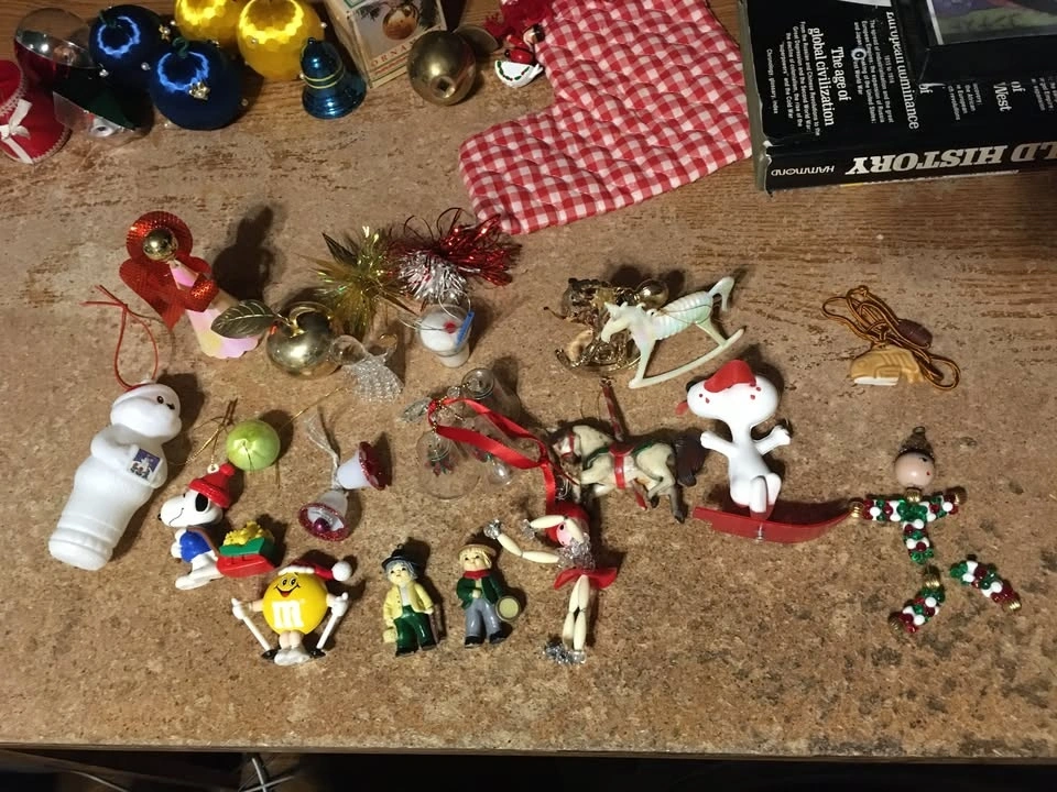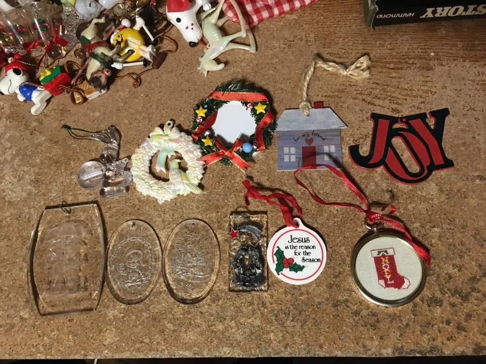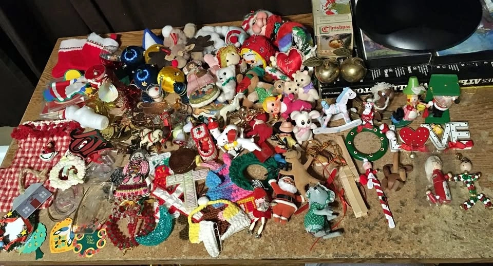 SOME AVON 12 DAYS OF CHRISTMAS, AVON LETTERS, HALLMARK, A SNOOPY, M&M'S, ENERGIZER BUNNY, MOST ARE UNBRANDED. SANTA FLOCKED, POLAR BEAR COUPLE FLOCK, MICKEY MOUSE FLOCKED, NO EYES. SEARS ROEBUCK APPLES. BOTTOM RIGHT HAS TWO ONE WOOD GRANDMA BROKEN ARE, ONE BEADED BROKEN LEG. STAR WITH ANGEL IN MIDDLE IS ENGRAVED.SOME ARE PROBABLY HAND MADE, OR A PLUSH THAT WAS PUT IN THE TREE