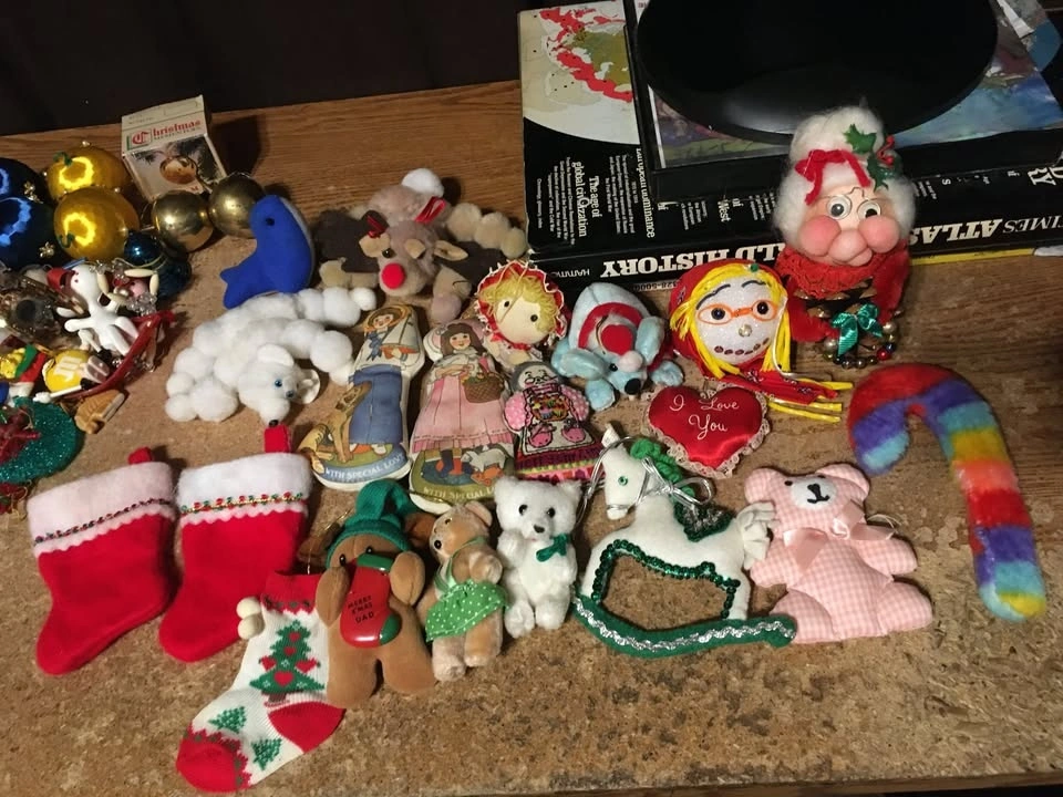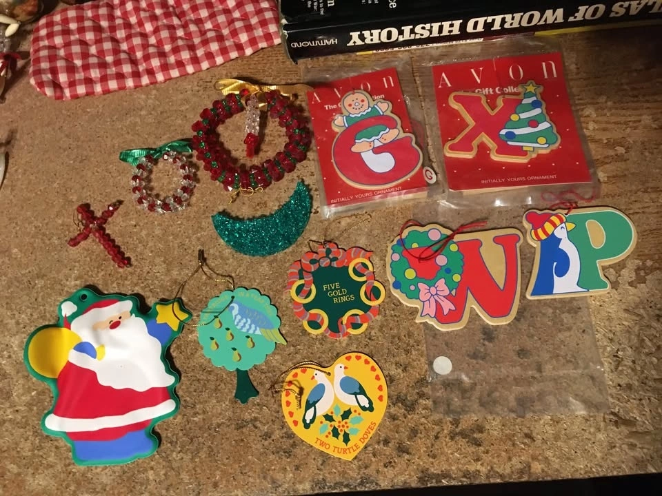 SOME AVON 12 DAYS OF CHRISTMAS, AVON LETTERS, HALLMARK, A SNOOPY, M&M'S, ENERGIZER BUNNY, MOST ARE UNBRANDED. SANTA FLOCKED, POLAR BEAR COUPLE FLOCK, MICKEY MOUSE FLOCKED, NO EYES. SEARS ROEBUCK APPLES. BOTTOM RIGHT HAS TWO ONE WOOD GRANDMA BROKEN ARE, ONE BEADED BROKEN LEG. STAR WITH ANGEL IN MIDDLE IS ENGRAVED.SOME ARE PROBABLY HAND MADE, OR A PLUSH THAT WAS PUT IN THE TREE