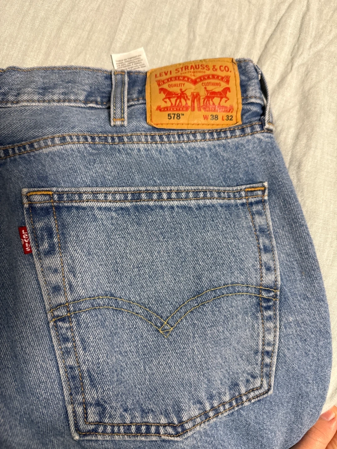 Classic Levi's 578 jeans in a blue wash. Waist is 38 inches and inseam is 32 inches. Made from durable denim. A timeless staple for any wardrobe!